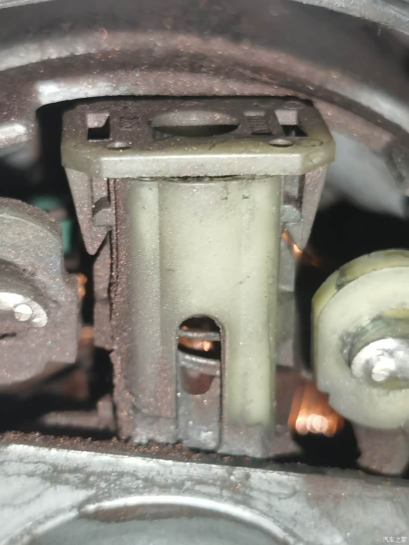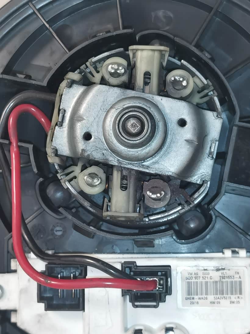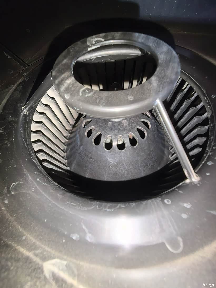 后面手太脏就没有拍照,虽然有空调滤芯过滤,鼓风机叶片还是吸附了很多灰尘,电机中倒出来大量的粉末,可能是滑块磨损下来的残渣,也有可能是叶片上灰尘积累厚了以后掉下来的。尽量清理掉这些灰尘,擦洗清理鼓风机叶片后晾干,给电机底部的轴承滴点机油,也不知道能起多大作用,顶部轴承因为在扇叶下怕拆坏了没敢拆。最后按原样装回去,插上电源插头,盖回盖板。