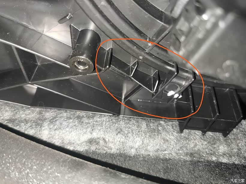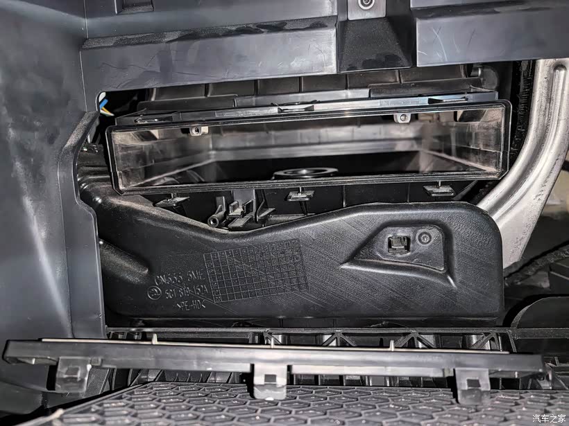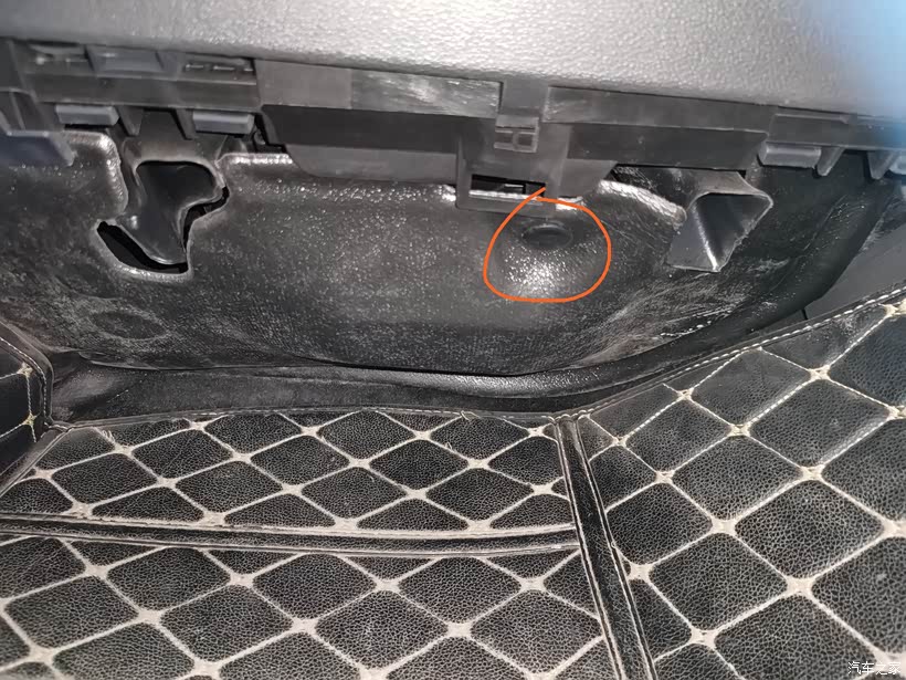从副驾脚下位置往上看,中控台底部是一片挡板,抠开圆形的卡钉,即可取下挡板。