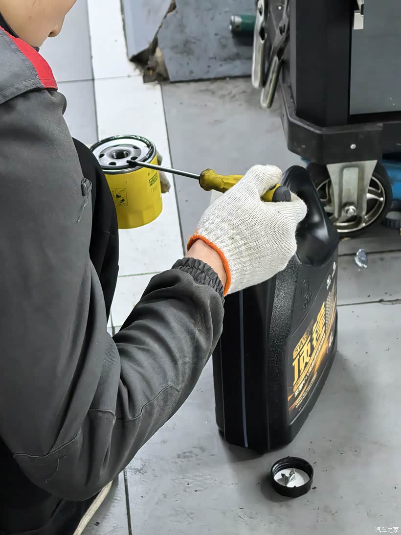 小师傅很认真的先在机滤密封圈上摸上机油