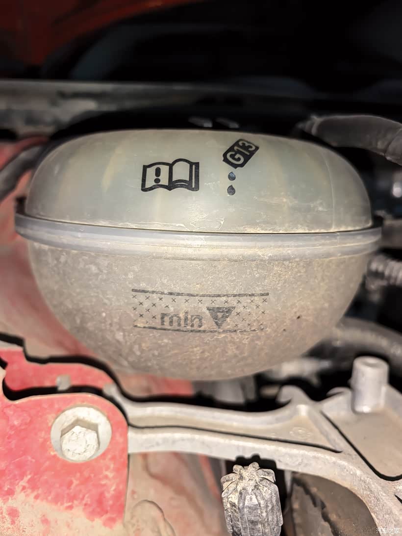 冷却液检查,液位下降了一些,里面还是清澈透亮的,大众原厂是长效防冻液,等到下限了再添点。