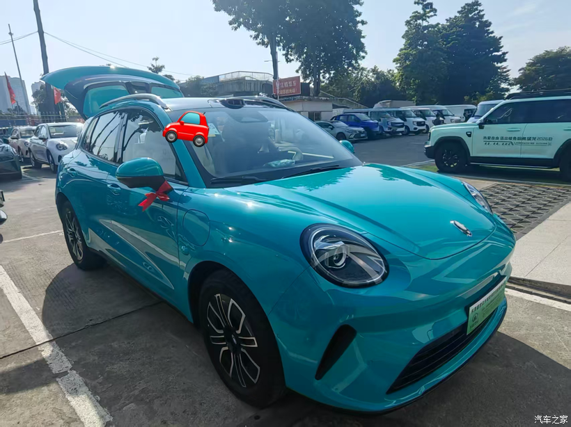 看到车上绑着红丝带,就知道是提我们的车了。车就停在门口显眼的位置,颜色挺亮眼,坐进去摸了摸座椅,手感还行,做工挺规整的,车里还送了欧拉的头枕和靠垫。