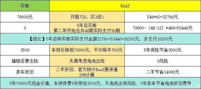 前几天,看到BAAS又出新政策了,以前买4赠1变成买3赠1,价值变化不大,还是算了一把,供参考,并且收集了一下关于BAAS和非BAAS在电池问题上面的一些区别(举例以5年为计算口径,这也是转买断补贴截止点)