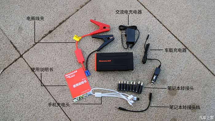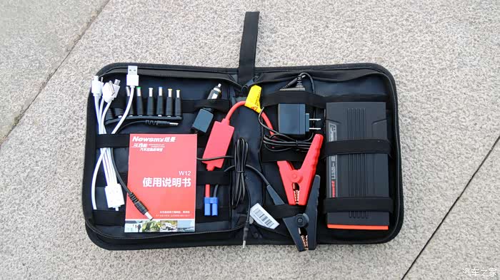 拉开手提包拉链,就像发现了一个百宝库似的。一块比手掌略大的启动电源,一根电瓶线夹,一个220V电源适配器,一个点烟器插头,还有好多转接头和手机插头!天呐,这装备也忒齐全了吧!怪不得包装箱上“多功能”三个字都写的那么大!这装备,我给满分!