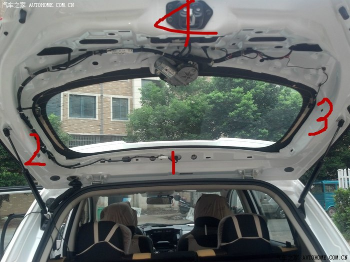 8、继续拆牌照灯面板,卸掉4个M5的螺母,再把手伸进后门空腔用老虎钳平面向上敲浅绿色塑料柱子,面板就可卸下来了