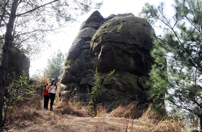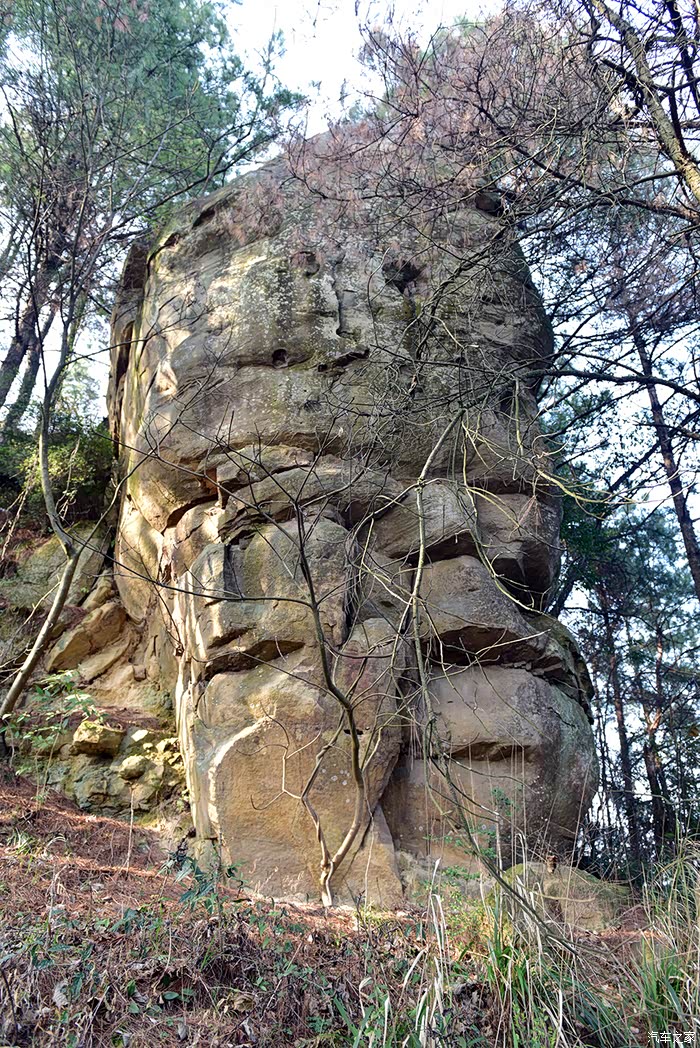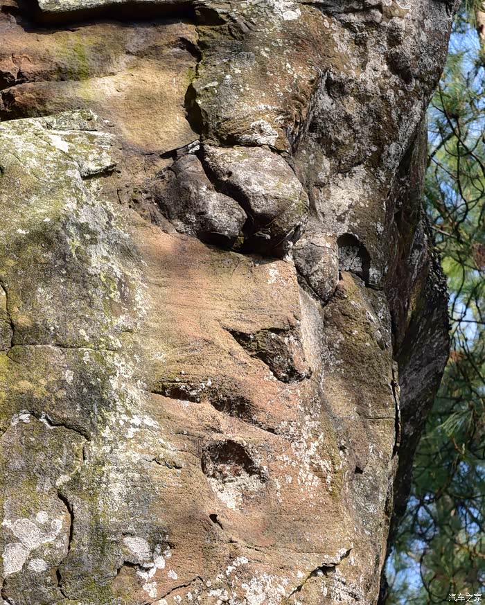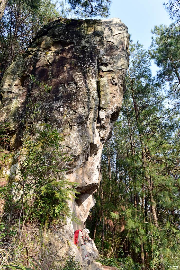 沿缓坡前行数十米,一高耸石崖扑入眼帘,这就是第二块巨石。其上有自然孕育,栩栩如生,比例精当,五官匀称的天然人头像。
