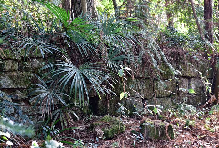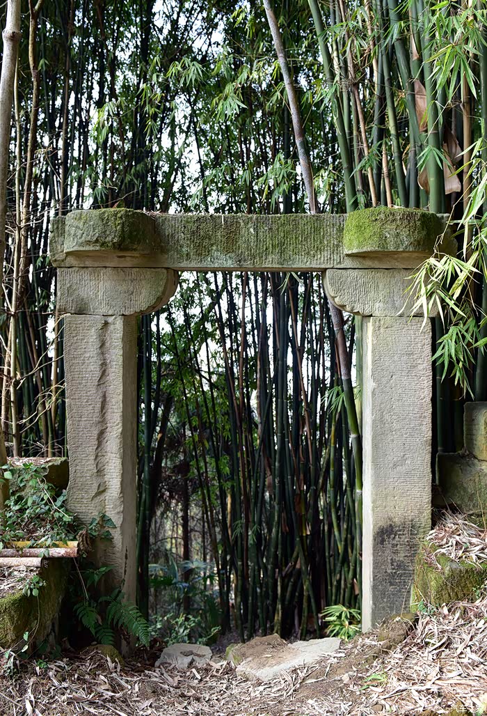 巨石的左边是毗卢寺,寺庙遗迹尚存,进出寺庙的石梯石门保存完好,石门对联仍清晰可见。上联:峻极于天能耸惧而矣;下联:事豫则立吾何抚乎哉。横批:守望相助。