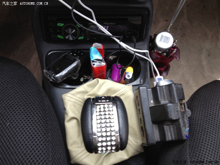 中控台全貌,因为在车上使用了MD机,手机充电器,点烟器式MP3,还有行车记录仪,所以电线比较多