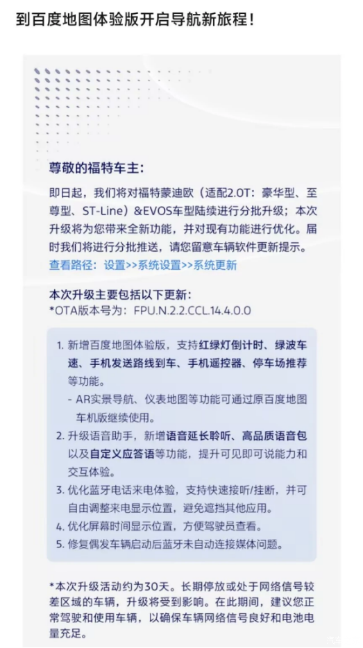 在蒙迪欧和锐界L车主团结一致的努力下 福特中国终于被迫升级了OTA车机导航 几百位车主一起努力的结果