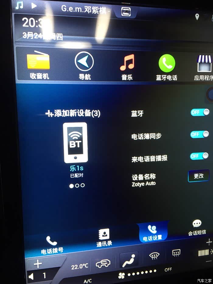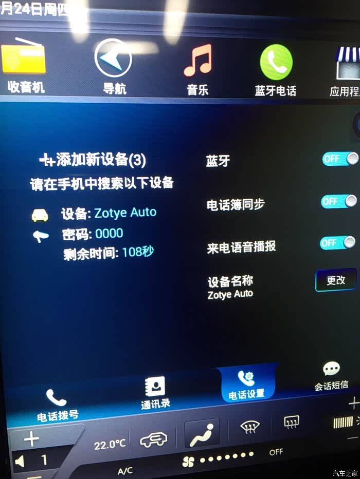 然后打开手机设置,打开蓝牙匹配,搜索到设备名称zotye Auto这个就是车载大屏,然后连接,匹配秘密是0000,所有手机蓝牙和车载大屏蓝牙连接都是这样设置,连接上和接下来第三步!