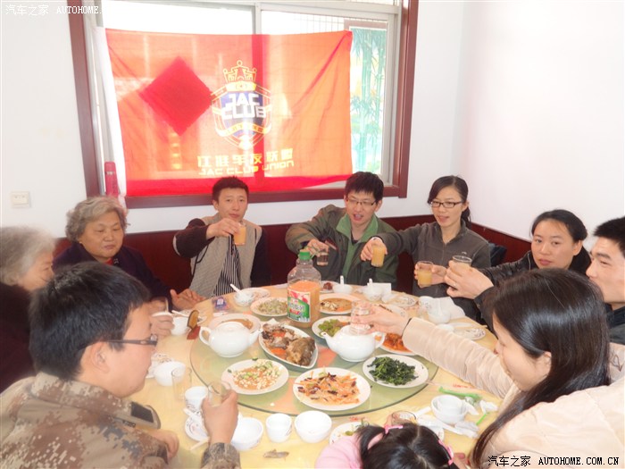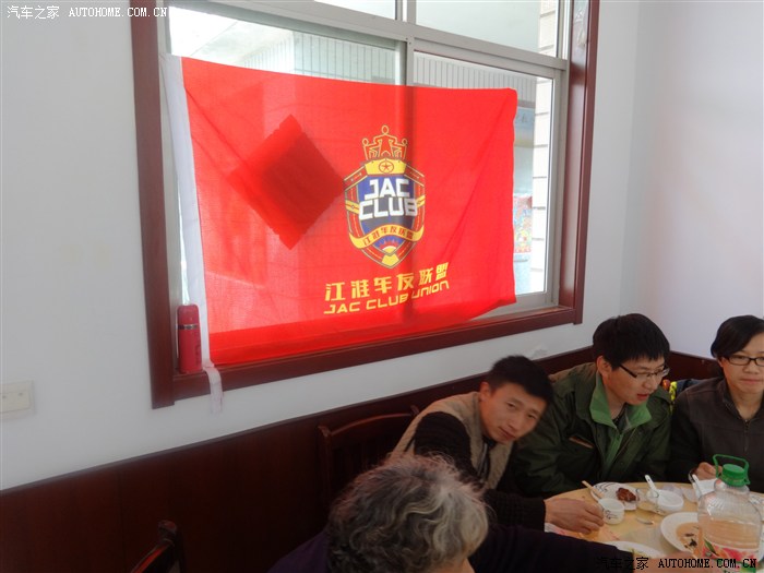 在鹿泉服务区内合影-分别河北江淮悦悦车友会江淮车友联盟旗帜,汽车之家河北悦悦车主营旗帜,石家庄江淮荣华4s店条幅!