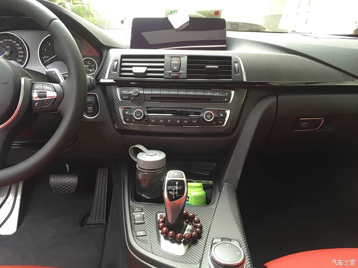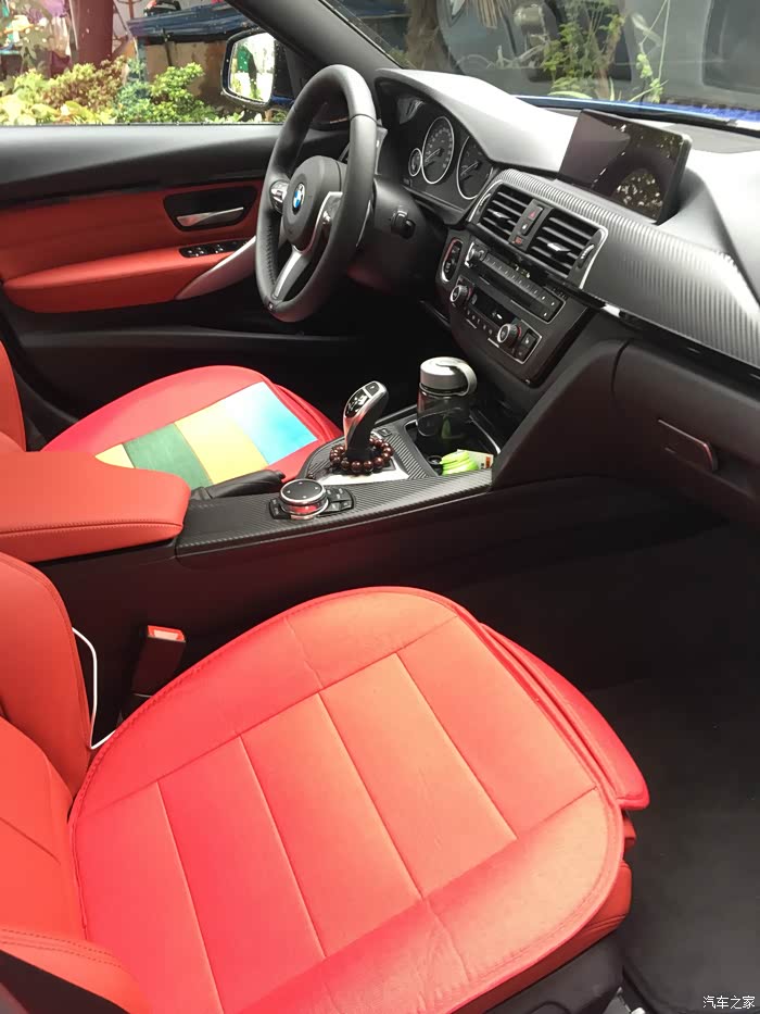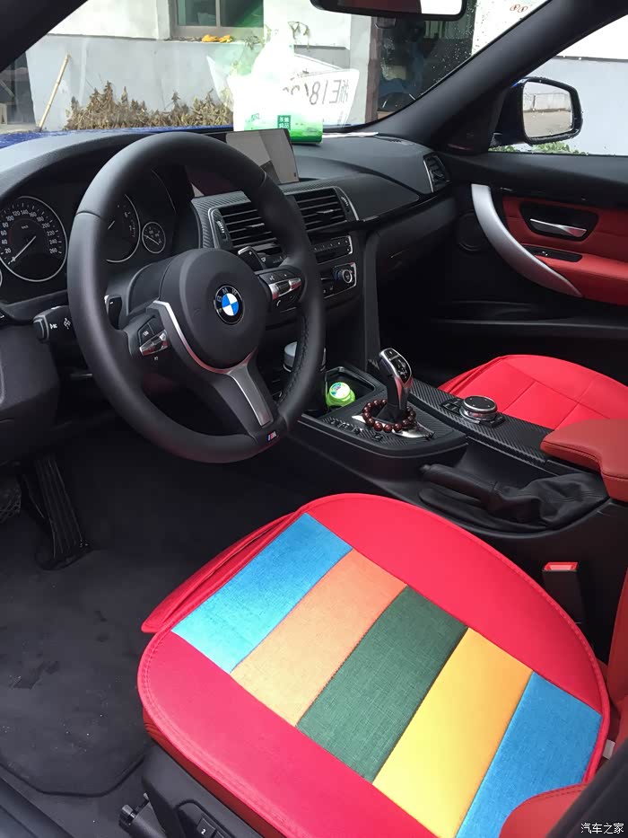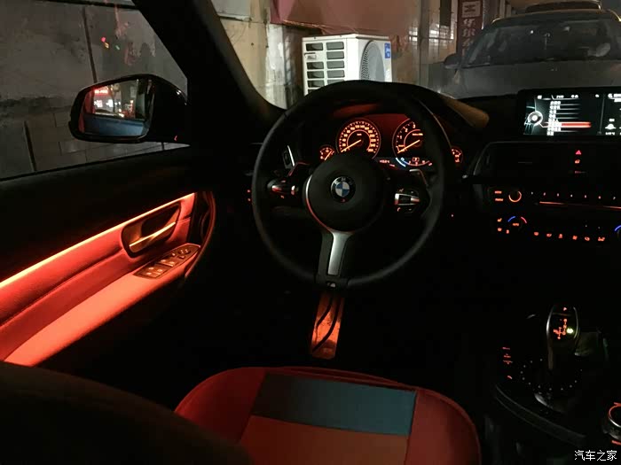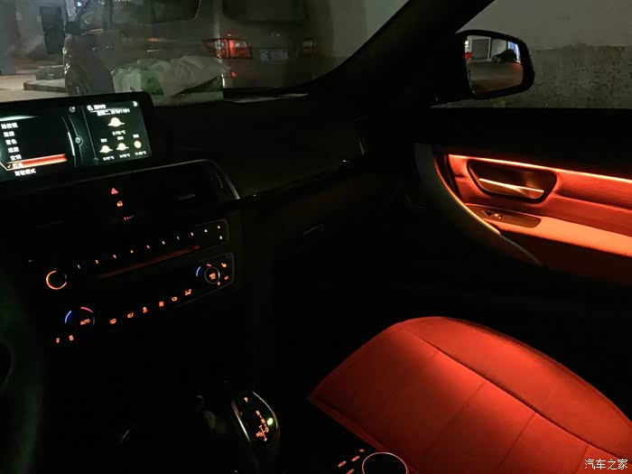内饰篇:吐槽最多的应该就是宝马的内饰了吧。确实,宝马的内饰算是BBA里做工不精细的,但是这款328IM丁字裤和大屏上身之后,让人眼前一亮,包括我很喜欢的红内饰,换言之,骚爆了!328唯一的遗憾是没有氛围灯,330是标配了氛围灯,不过这并不妨碍我,后期果断去加装,不然晚上开车车里确实挺黑的。装了氛围灯之后确实B格爆表,但是心疼门把手拆拆装装,不过还算是值得。另外我还贴了碳纤维的内饰,就先这样改了吧,以后想换一套MP的内饰,不过我自己贴了1小时,也是成就感满满。