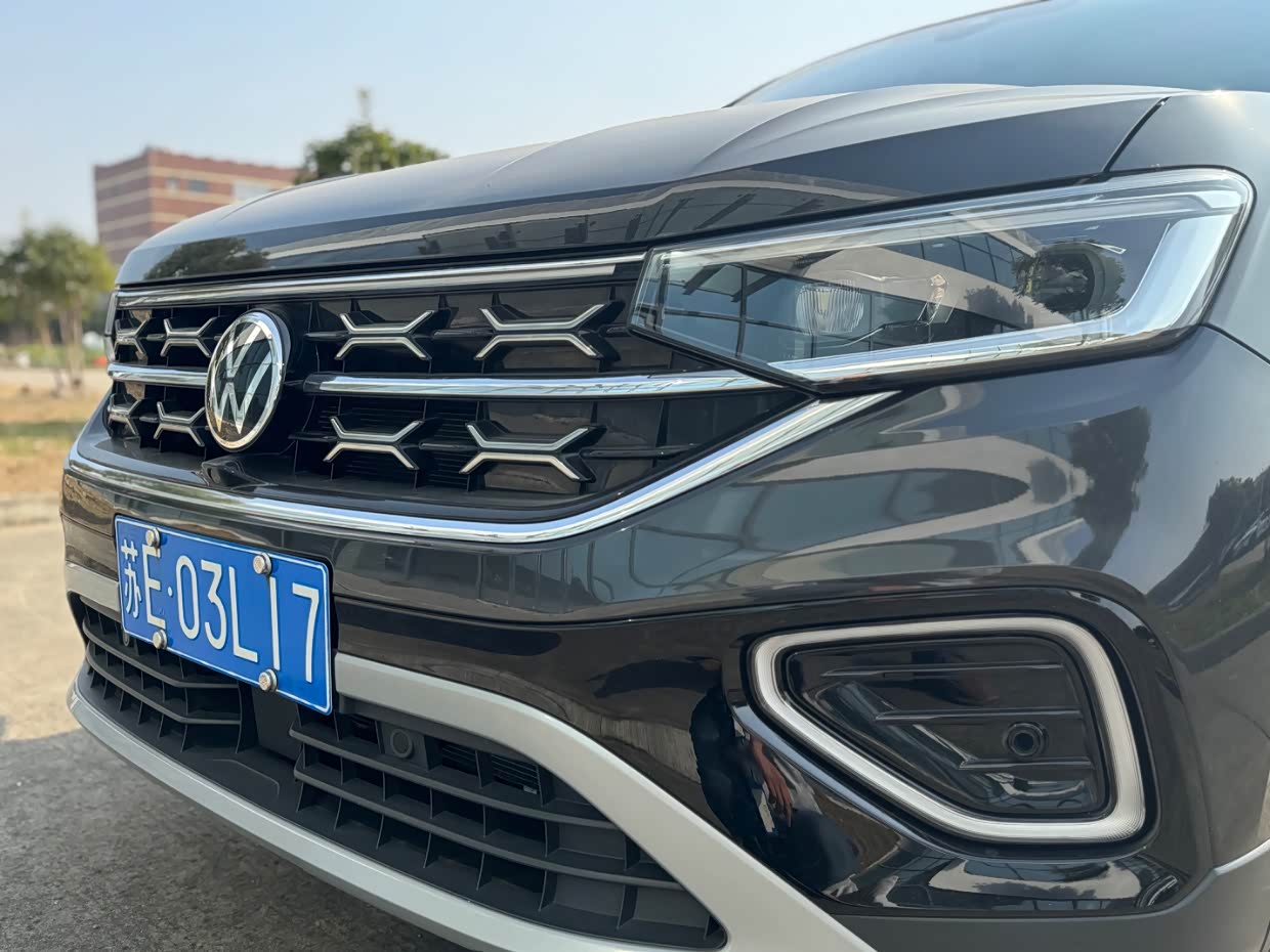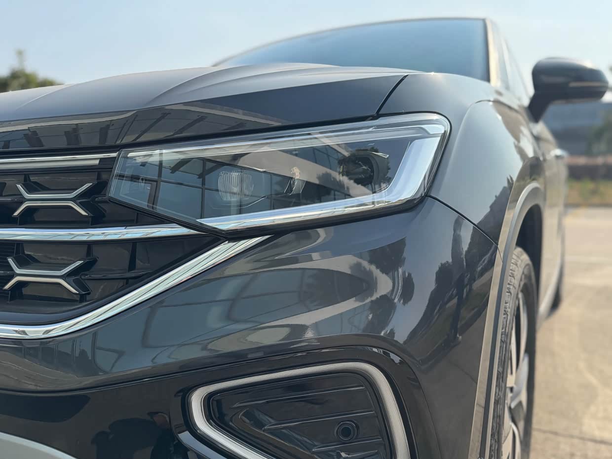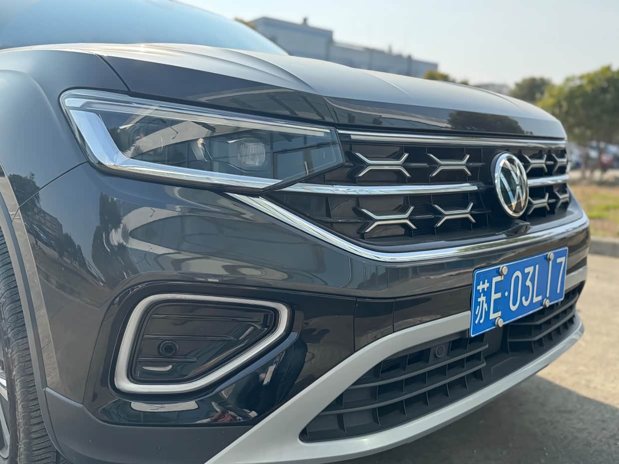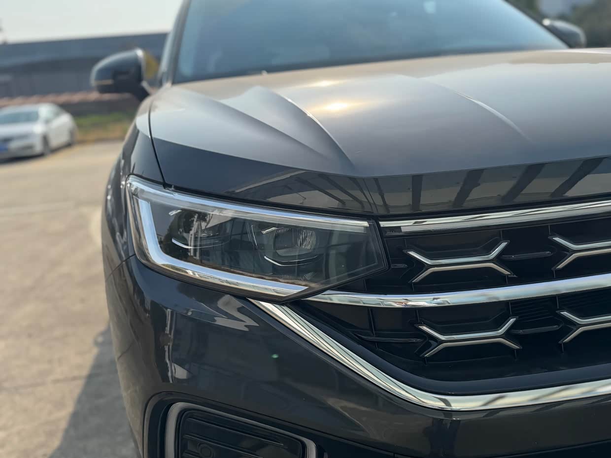 探岳的外观设计也是大众家族元素,整体展现出稳健的特质以及大气的外观,前脸上宽大的横向镀铬进气格栅,两侧LED大灯组很自然地衔接,特别能感受到宽阔又稳重的观感。LED日间行车灯点亮时很特别,也增强了车辆的辨识度,整体很有越野气息。