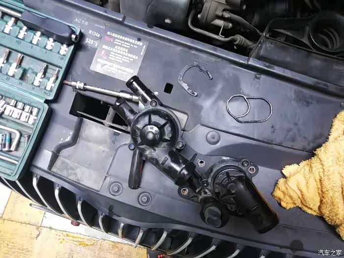 。还好有晶锐的旧单节温器备用(2者结构完全一致)。拆原厂上87℃的节温器换上。换新密封圈。凃上适量密封胶后复位。