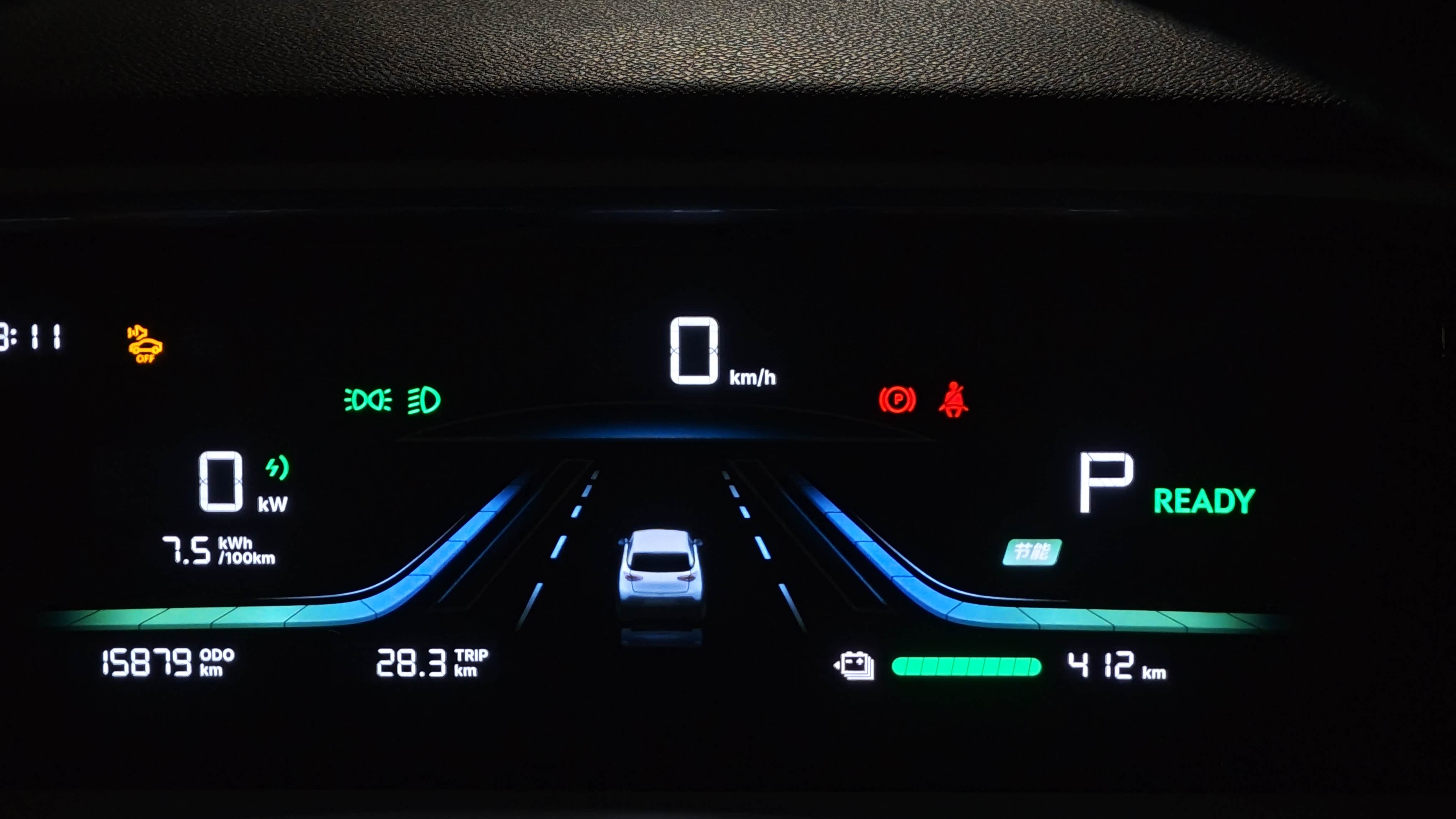 续航表现,现在步入秋天空调不用开纯驾驶,能耗非常低最低开到7.4KW/km,开了30公里续航还有410。