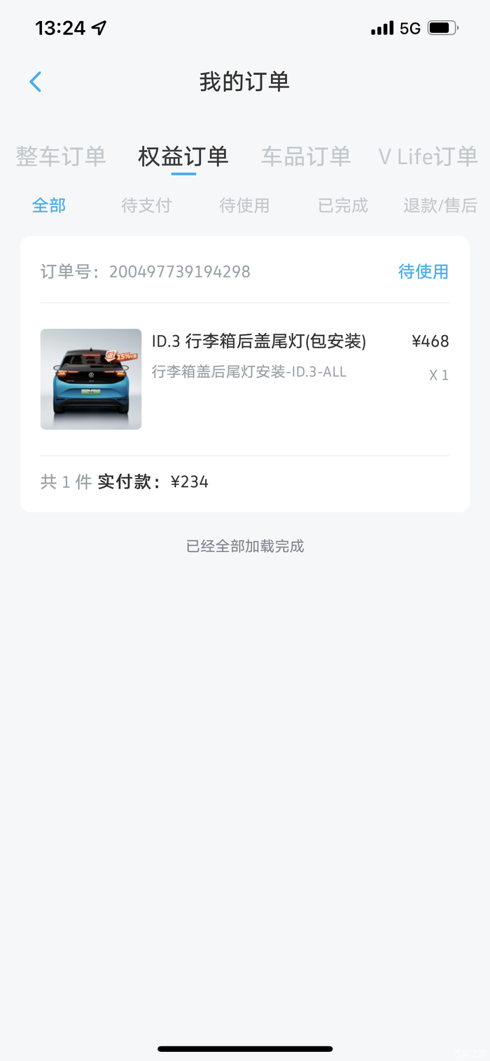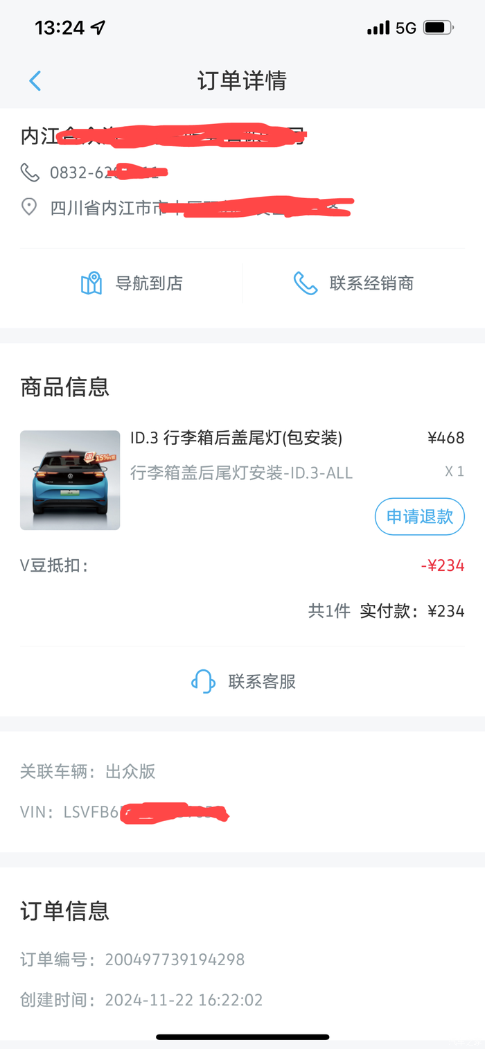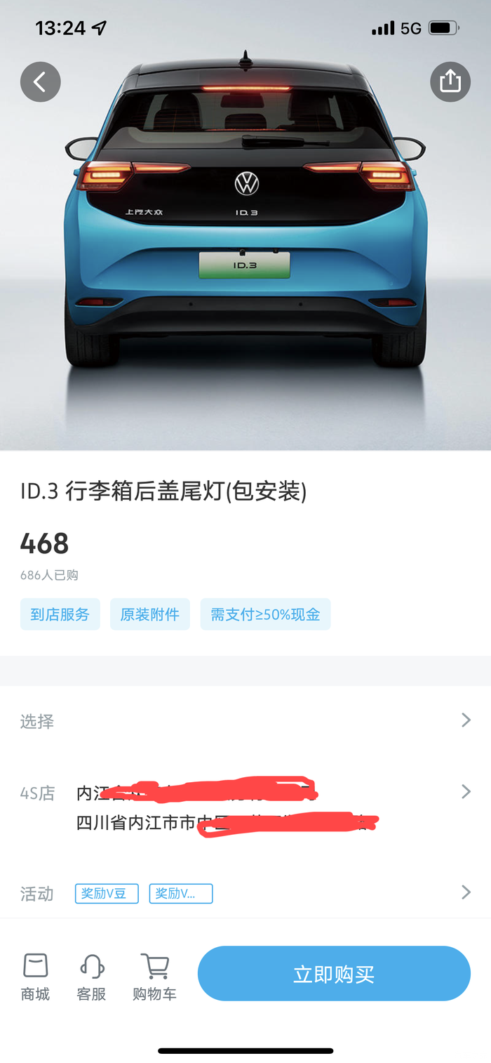购买后盖尾灯有2个途径,一个就是网购,价格便宜一些,自己安装或者找师傅安装,没有质保。另外一个途径就是通过官方APP,在里面的商城下单,到4S店去安装,免费,有质保。当然,我选择了后者,因为有V豆可以抵扣一半现金,另外安装后有质保也很重要。