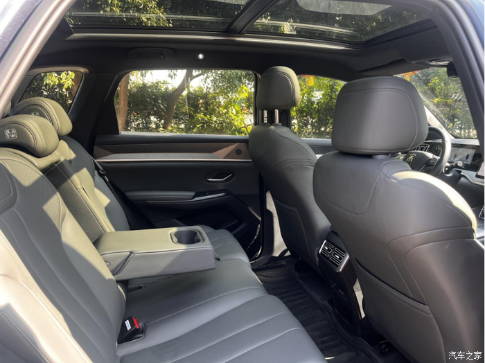 空间它完全够用,甚至有点惊喜。我在前排调好坐姿后,坐到后排膝盖离前排座椅靠背还有两拳多的距离,翘个二郎腿完全没问题。最舒服的是后排中间地板是平的,坐满三个人时,中间那位脚不会没地方放,长时间坐也不会太难受。