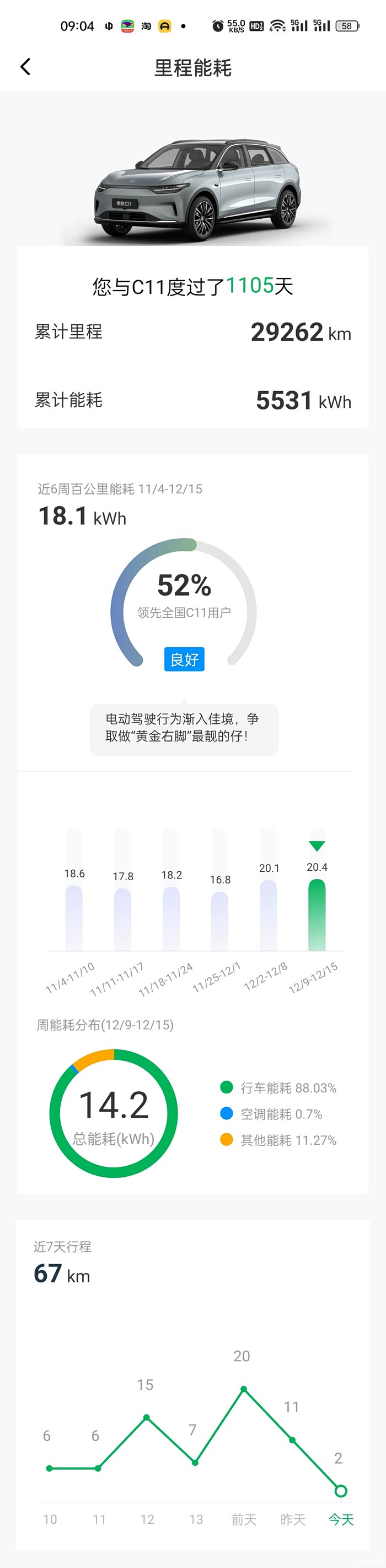 气温下来了,能耗从14到18上去了,毕竟是暖空调会影响能耗,但整体上说,电费还是便宜,用着并不觉得油车时代的心疼钱。但缺点是C11并不是热泵空调。