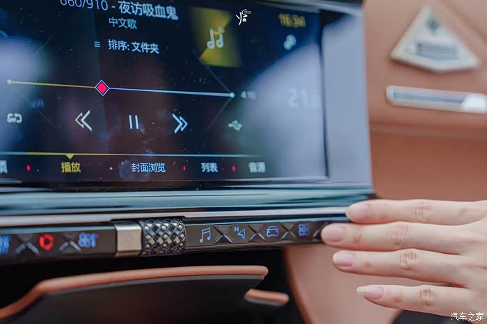 全包围的主驾设计,仿佛在开战斗机,并且车内还有细节感满满的设计,例如全车的真皮包裹,并且还配有菱形的纹路作为点缀。而中控屏下方的按钮也是同样有菱形线条设计有立体感的玻璃制作而成的(只是这个纯触摸没有动力回弹或震动作为回馈,没办法盲操),还有就是中控屏下方的音量旋钮,上面镶嵌着的则是黑水晶。