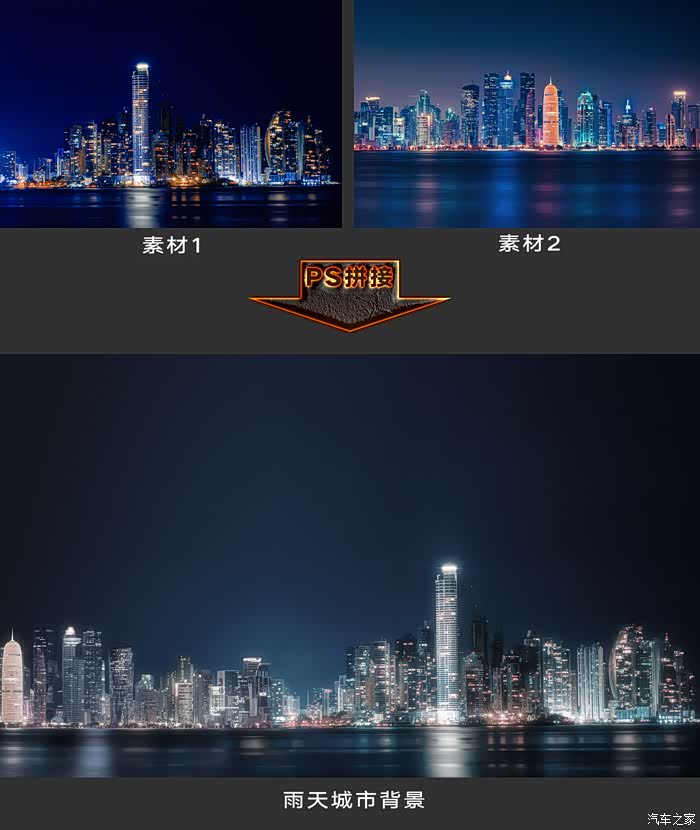 我想做一张都市夜景的宽幅背景图图,网上找了很久找到两张理想的角度的照片。PS拼接一下,颜色调灰,还有下雨天那种灰蒙蒙的感觉。