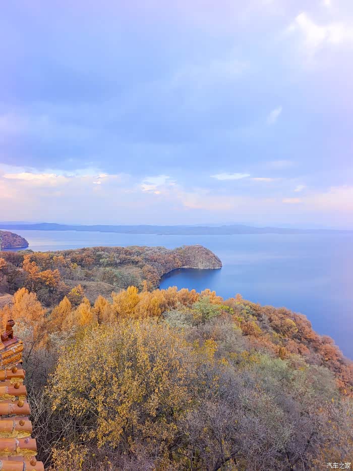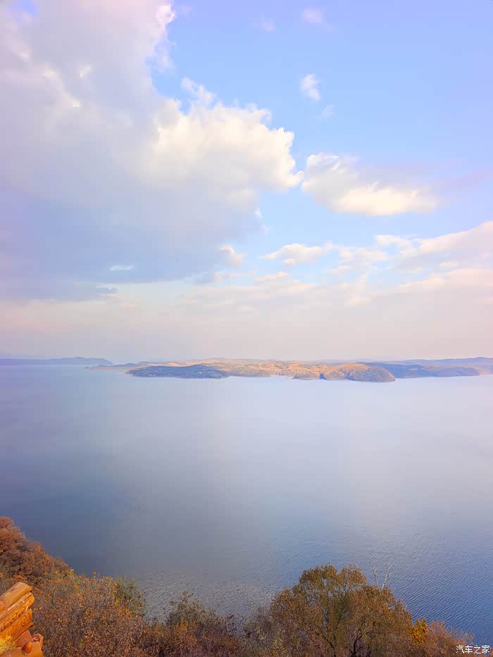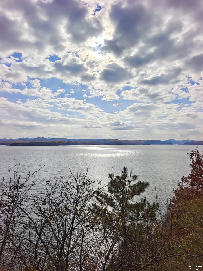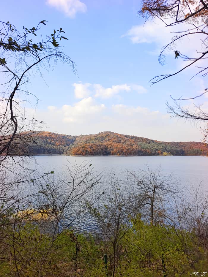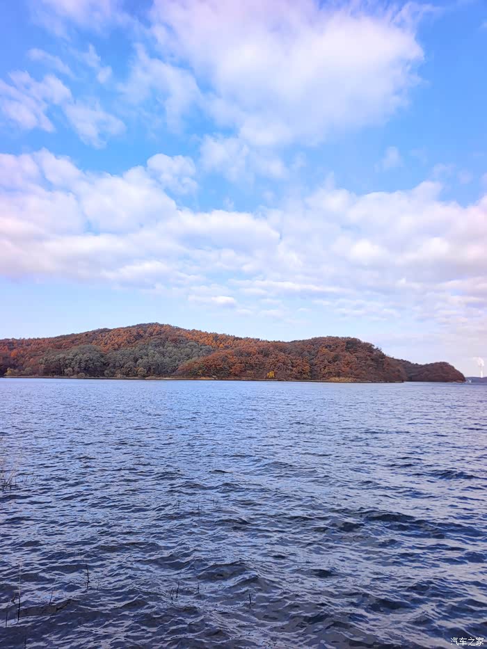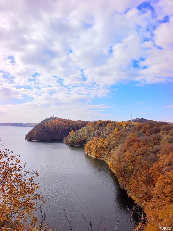 跟媳妇交代好看好老妈和女儿后,我便独自启程了。前行一公里多,就看见了大伙房水库一角。对岸的小岛被称为“小青岛”,到了这个时节,金黄的槭树、翠绿的松树与嫣红的枫类交织,像打翻了的调色盘。