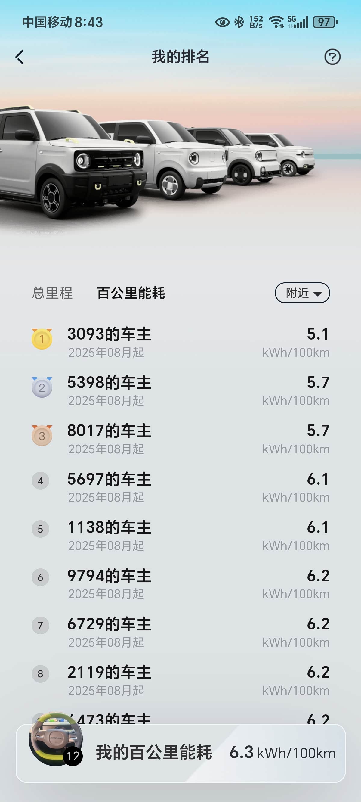 现在天气40多度,上车就是空调,自己最少都是9点几的能耗,6点几的能耗自己开不出来呀,羡慕不开空调的地方