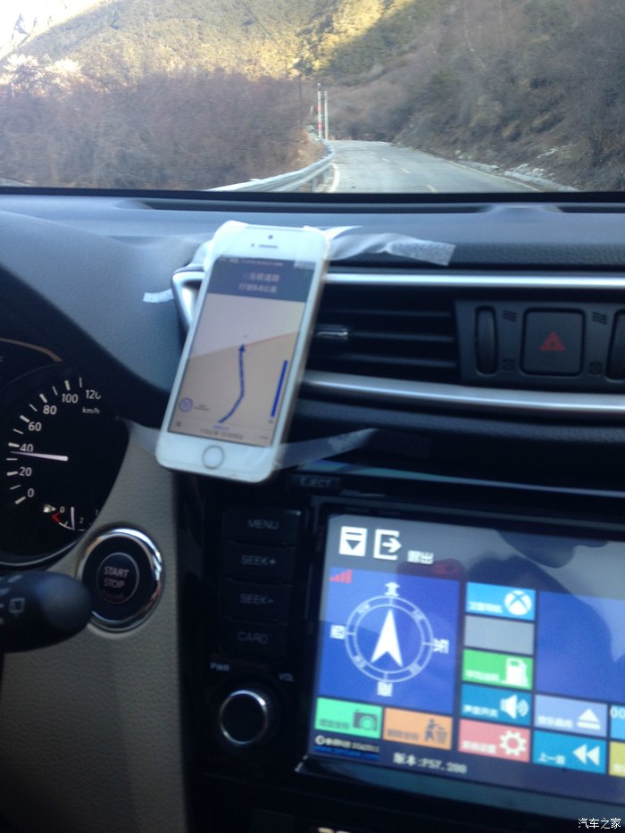 车上没有支架就用胶布固定,车载导航到这里已经没有路了,所以只有看手机百度地图。