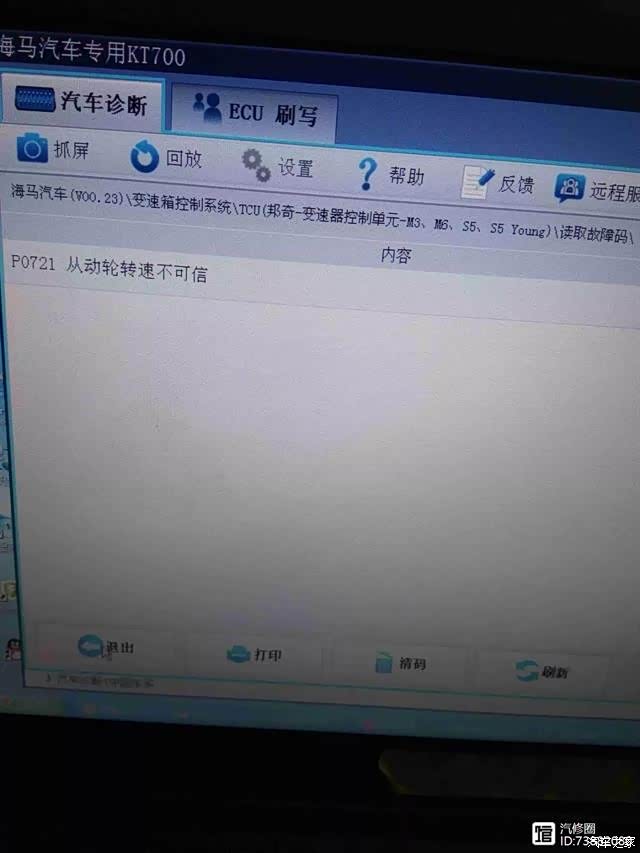 使用海马专用设备读取各个系统,只有变速箱系统有故障码,P0721从动轮转速信号不可信。