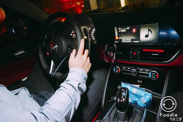 第一个路口转弯、屁股就体验到了giulia的不羁、能明显感觉出车尾向外侧轻微甩出的动作、出弯后的直线提速更是在拼命压榨我的肾上腺素、强烈的推背感惊得后座女友花容失色