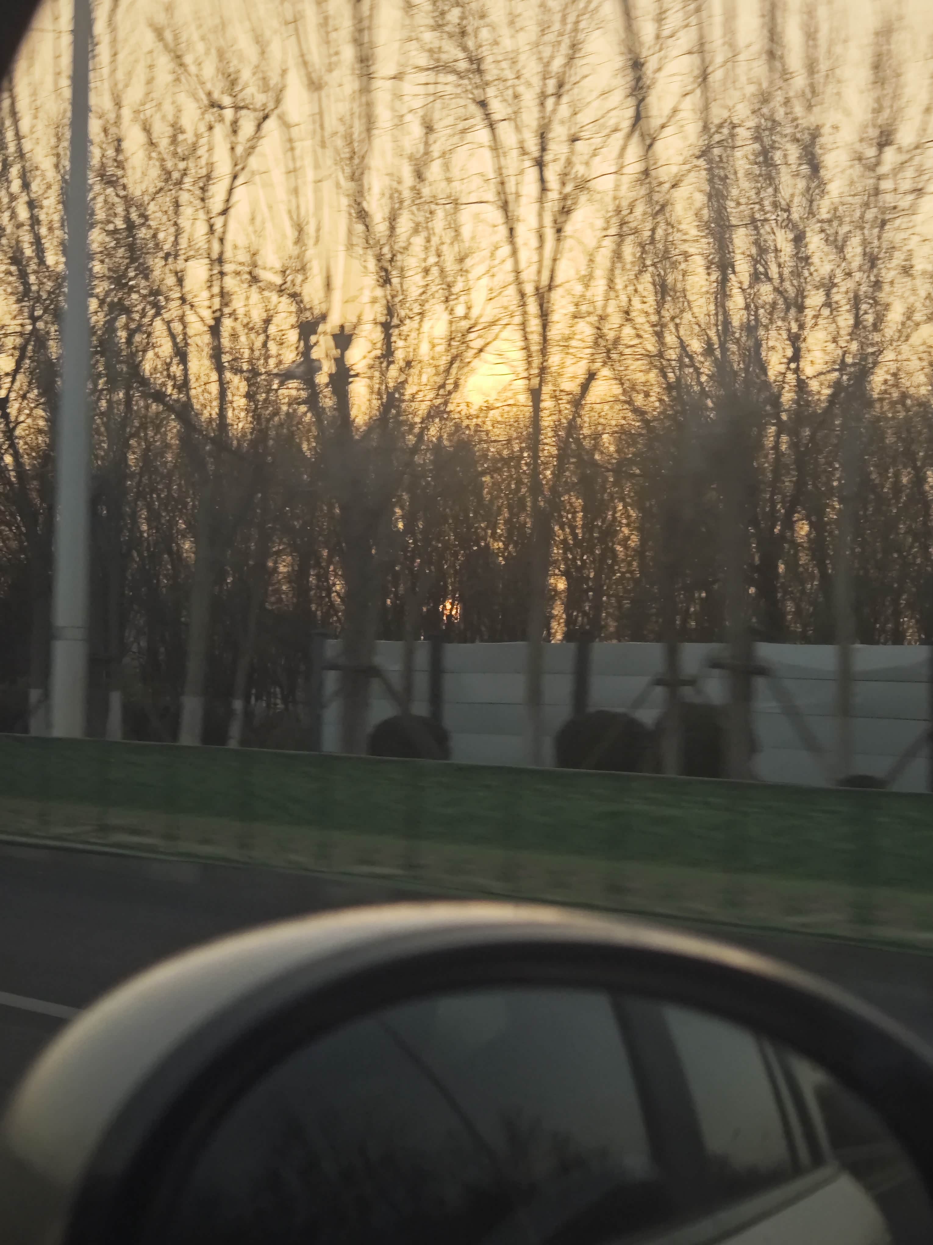 在外环东路上的时候,看到远处的太阳特别圆,虽然天气不好,但是太阳还是很圆的,想要拍的时候已经进入了茂密的树林范围,把太阳挡住了,拍不上了。