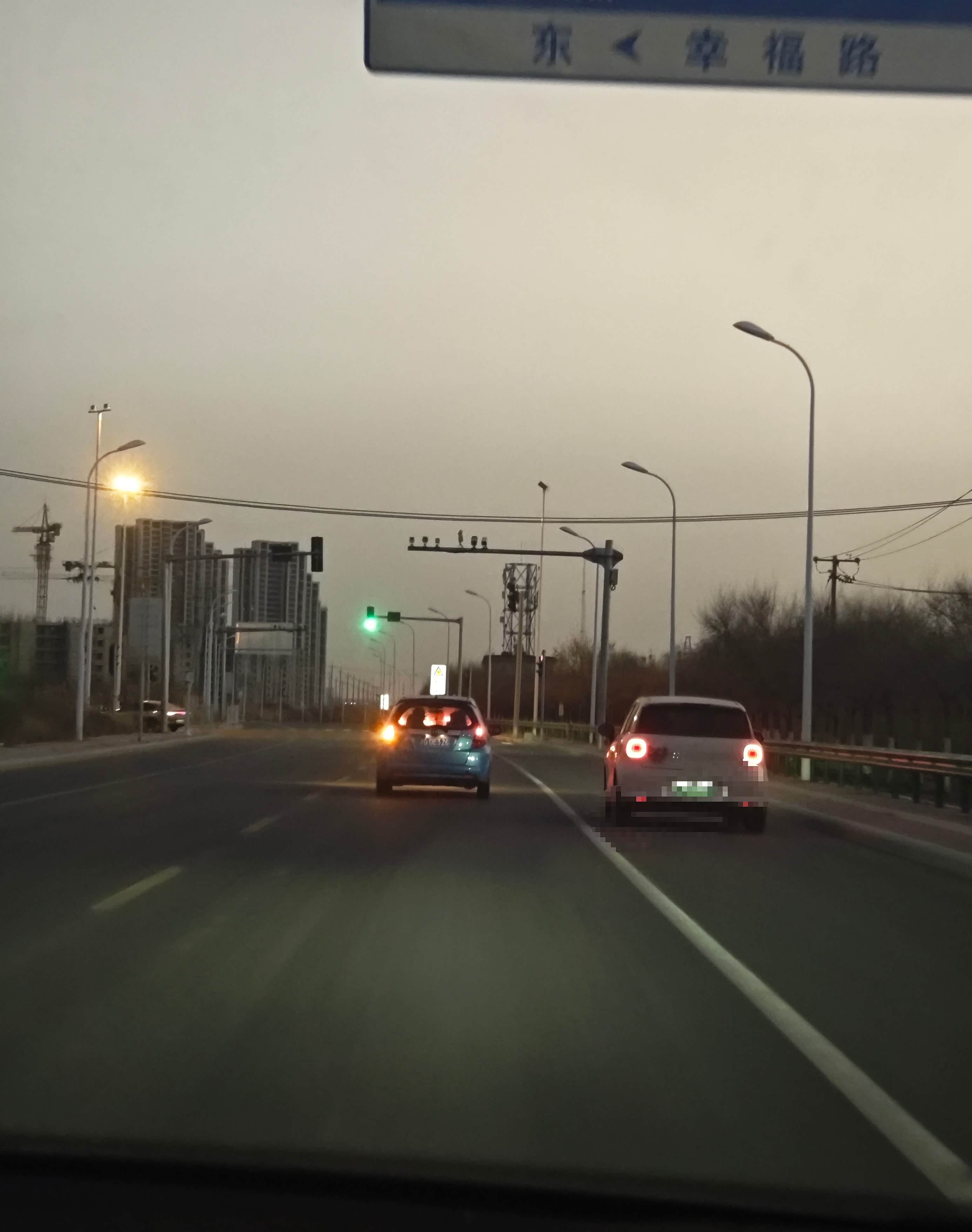 海教园地铁站的路口前方的那个高速是津港高速的入口,当时这个路口很乱,我都怕我绿灯了,根本就插不过去呀。所以才拿出手机拍了张照片,记录一下当时的情形,直行的直行,左转的左转,右转的右转。真的很乱。最后我们是快变成红灯的时候过去的。