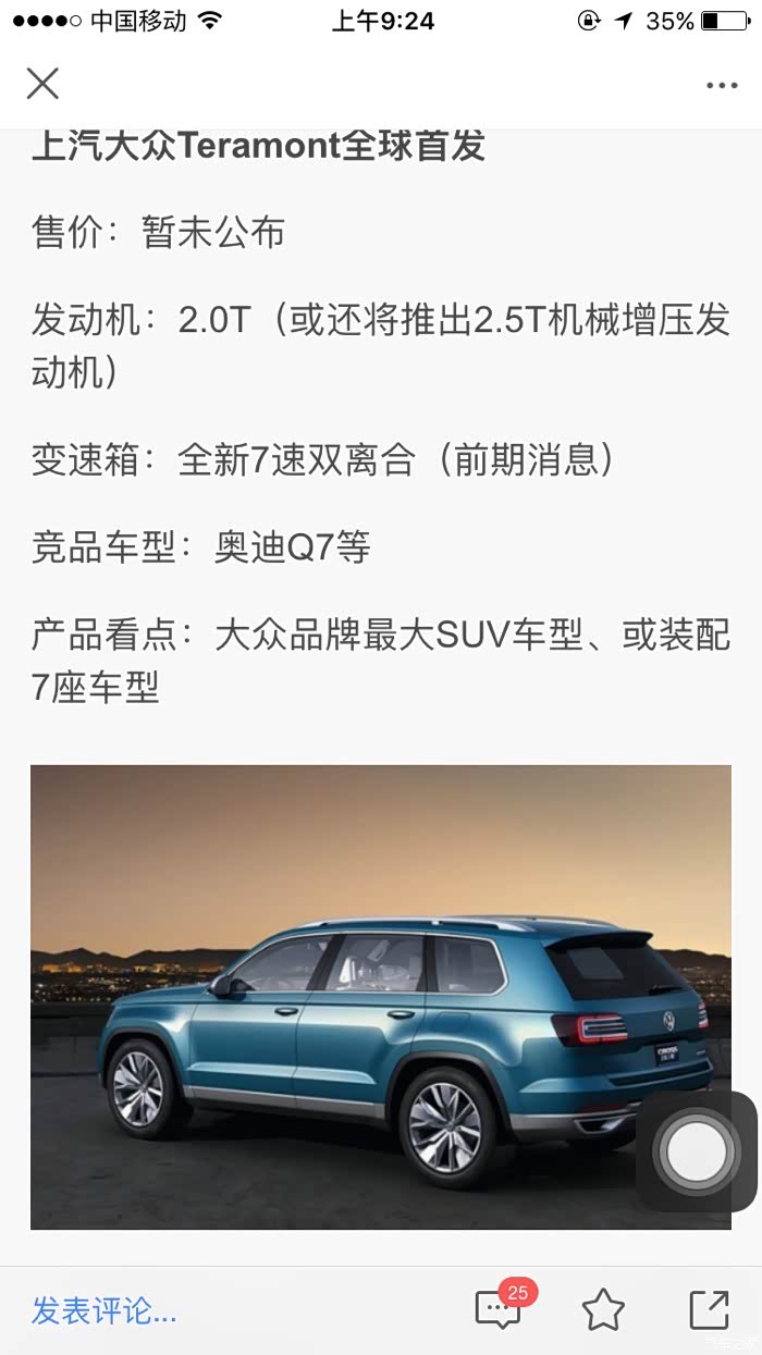 这车比Q7高,比Q7宽,只比Q7略短一点点,体型基本碾压。全球首发2.5T发动机,凝聚大众最新科技。
