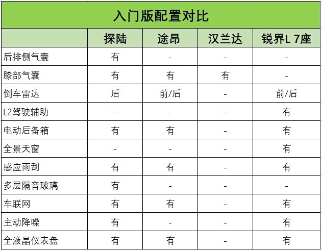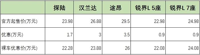 只有锐界L的起售价比探陆便宜,但锐界L少了2个座位,不符合我们说的大7座的要求。7座版起售是24.08万元。可见最便宜的还是探陆。