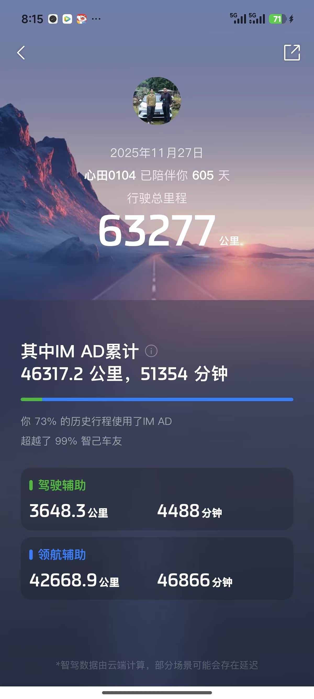 说起辅助驾驶(智驾),大家首先想到的往往是华为乾坤ADS和特斯拉FSD。而对于车辆辅助驾驶系统有深入了解的人,肯定不会忽视Momenta——这家与创始人曹总一样低调务实却实力非凡的方案公司。作为一名智己23款LS6的车主,至今这台智己已陪伴我605天,总行驶里程达到63277公里,其中IM AD里程为42668.9公里。今天,我就以一位Momenta领航辅助里程超过4万公里的车主身份,分享自己的使用感受。