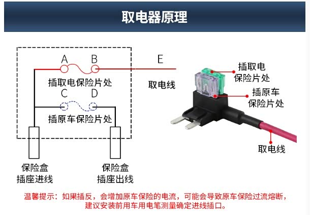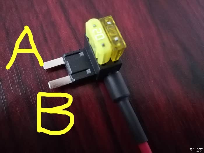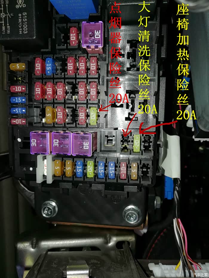 7、将装好20A保险丝的取电器插在大灯清洗保险丝基座上。如图: