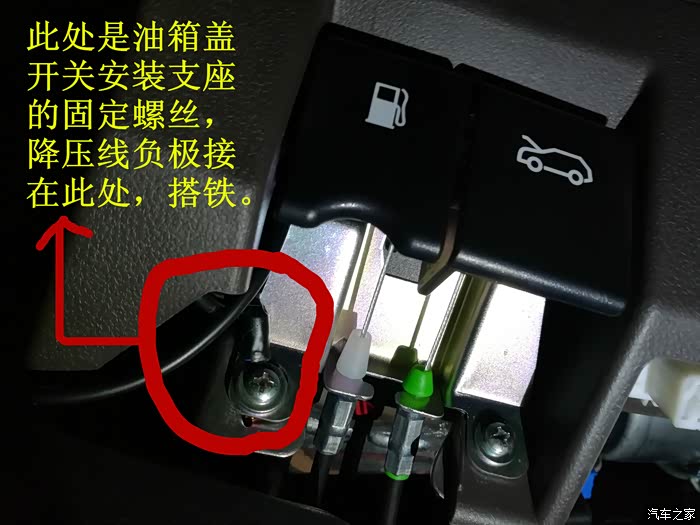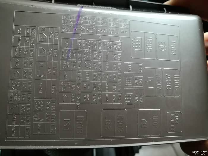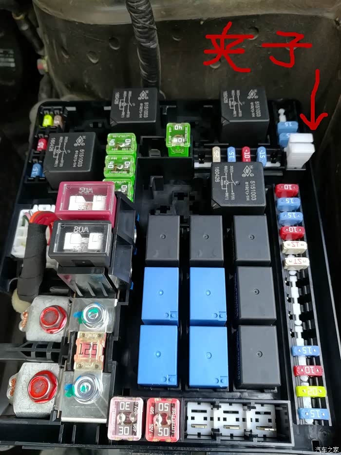 1.接线准备工作开始了,打开引擎盖,找到机舱内的保险丝盒,并打开(至于怎么打开请参考论坛内其他车友的帖子,在这里我不再叙述),如图;