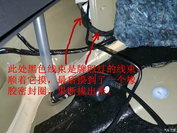 3、将安装好后摄像头的灯罩替换拆下来的原装灯罩,并把线穿过灯罩那里的孔,然后从后保险杠塑料壳内侧将线拉出来。