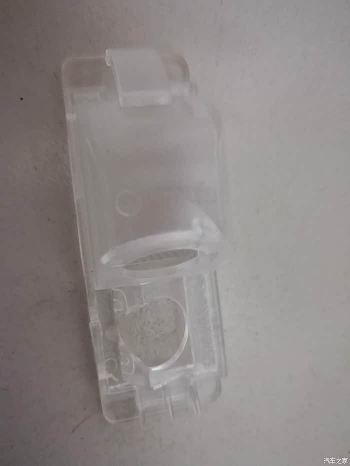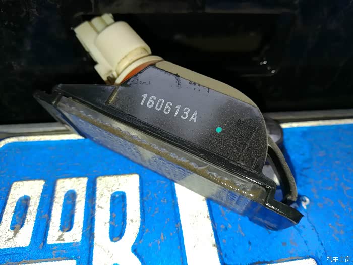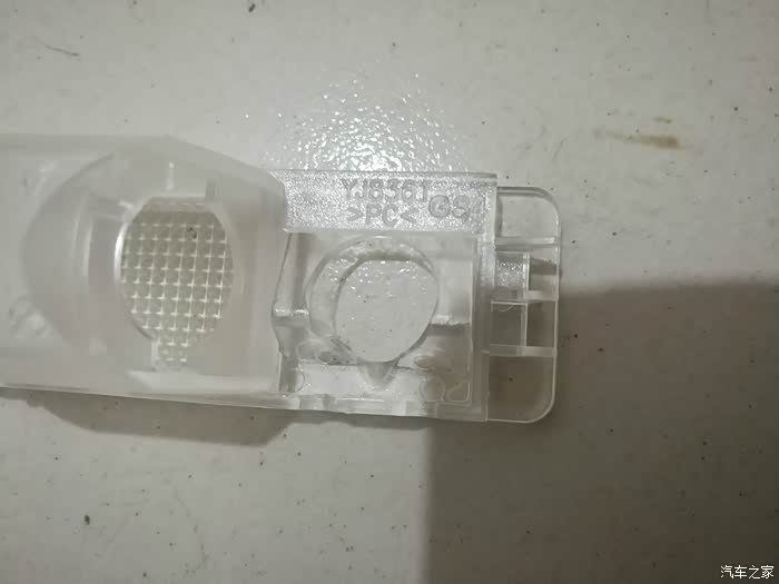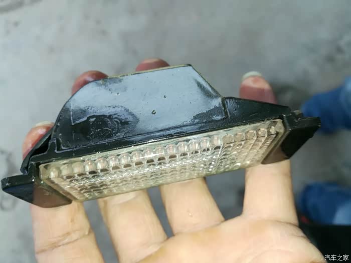 2、将原装的牌照灯罩用小号的平口螺丝刀沿着两边黑色小方块边缘稍微用力撬下来,如图: