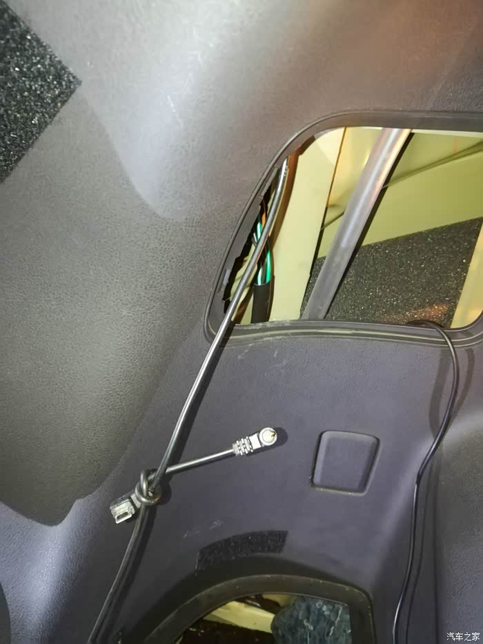 5、寻找合适的孔洞穿线,将线从车外穿到车内。