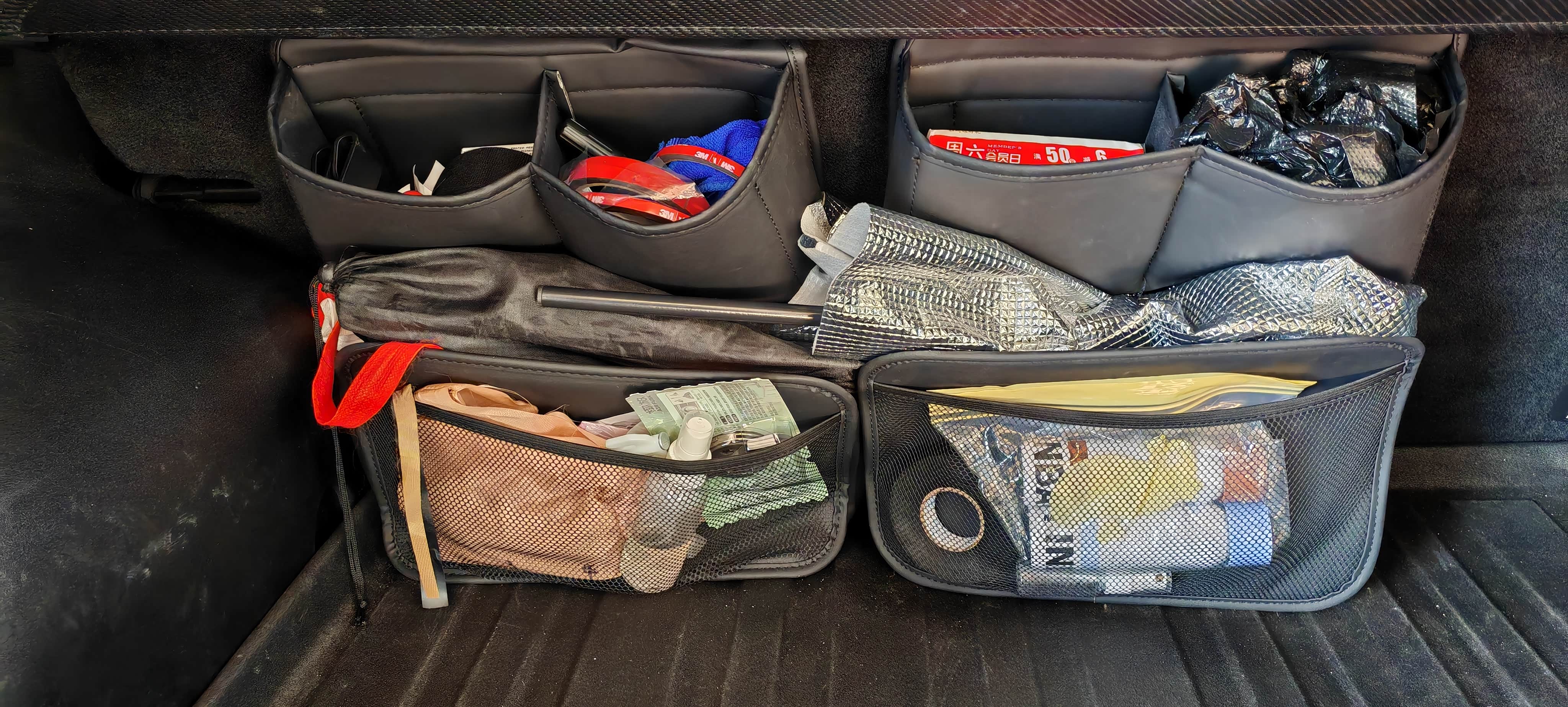 其实,除出去游玩儿穿越外,日常通勤用车后备箱多数时间无需放置过多物品,多数也就是玻璃水、雨伞、湿巾纸巾、简单工具等常用物品,放置分层置物架又不太方便,经过各种比对考量,最终我选用了一款后备箱置物袋,无论是方便程度还是置物能力真的出乎意料地好。
