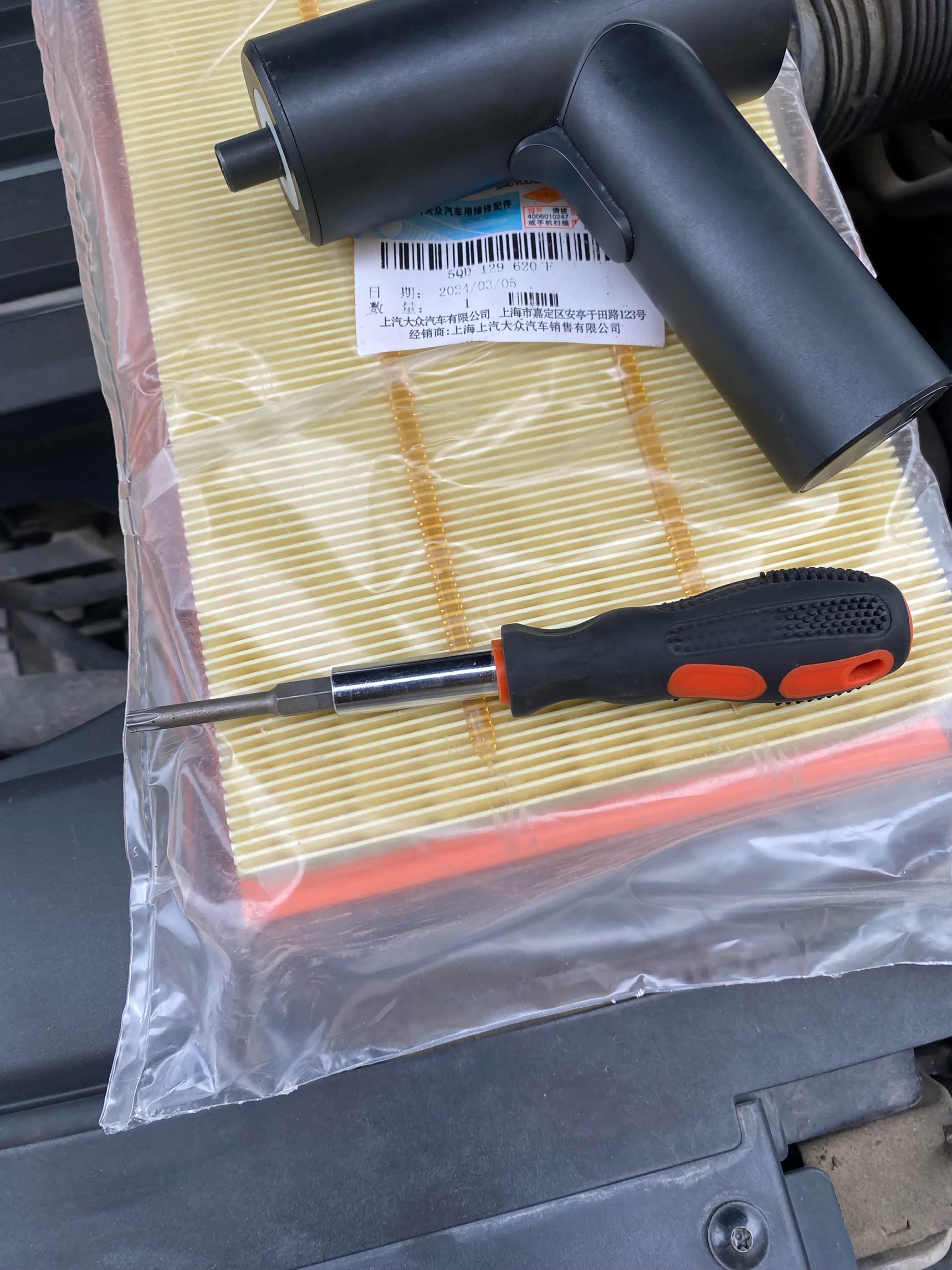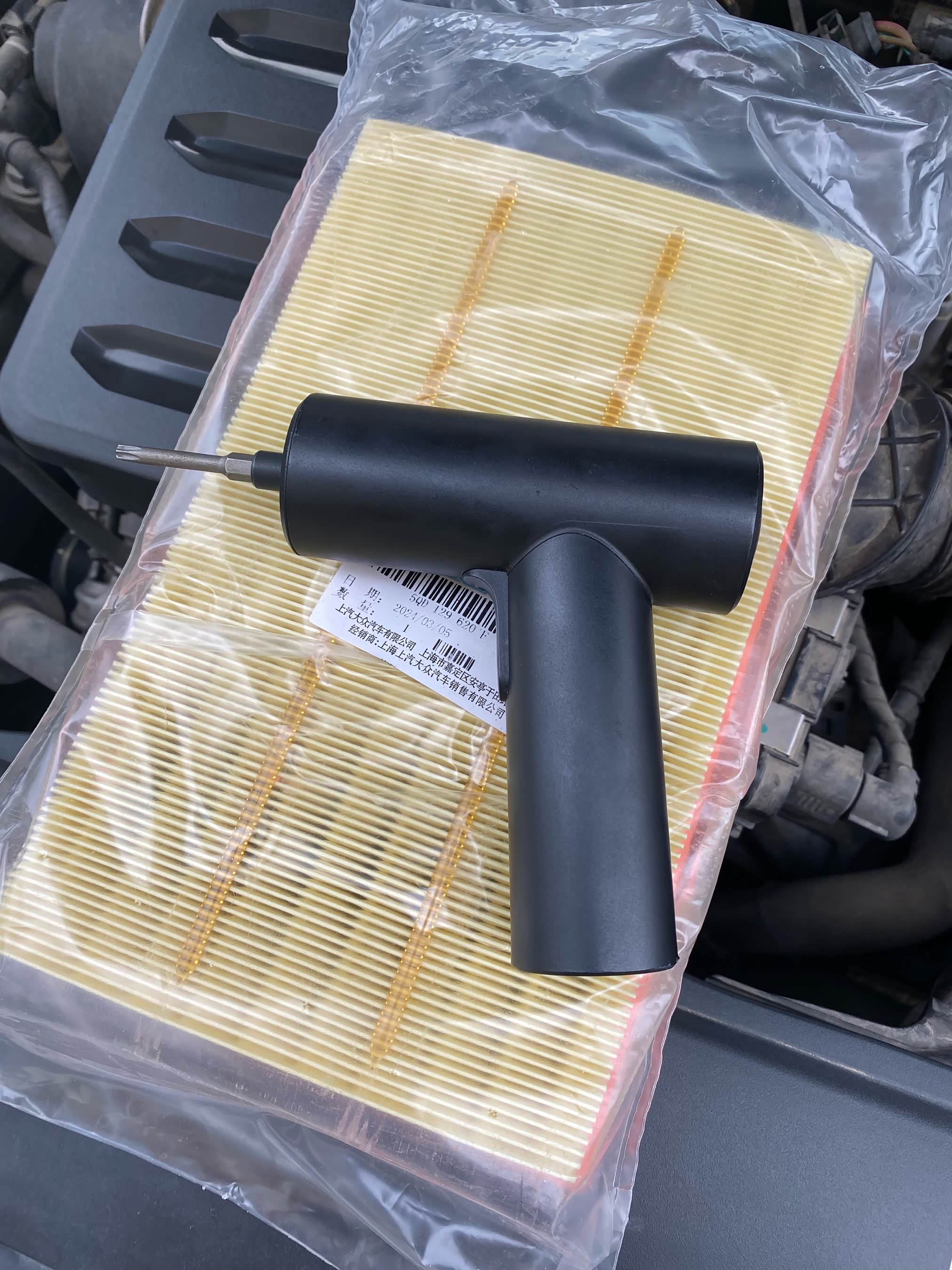 话不多说,先来准备一下需要更换空气滤芯的装备吧。首先需要购买一个新的空气滤芯和更换的工具。空气滤芯的话我是在店里买的。原厂的空气滤芯价格是79块钱,质量上面儿感觉更好一些,所以说我一直更换的是原厂的空气滤芯。毕竟一年只换一次。花费也不是太高。然后就需要准备一个T25的螺丝刀。当然如果没有T25的话,那T20的也是可以使用的。如果想省事儿的话可以弄一个电动的螺丝刀。这样子更方便一些,但是一定要注意扭矩。因为这个空气滤芯的螺丝是子公司的。扭矩太大的话容易把它给打滑丝。所以这个一定要注意了。我准备了一把电动螺丝刀,还准备了一把手动的。电动螺丝刀可以在拆卸的时候用,手动的话在预拧紧之后再扭一下,防止扭矩太大,把螺丝给打滑了。