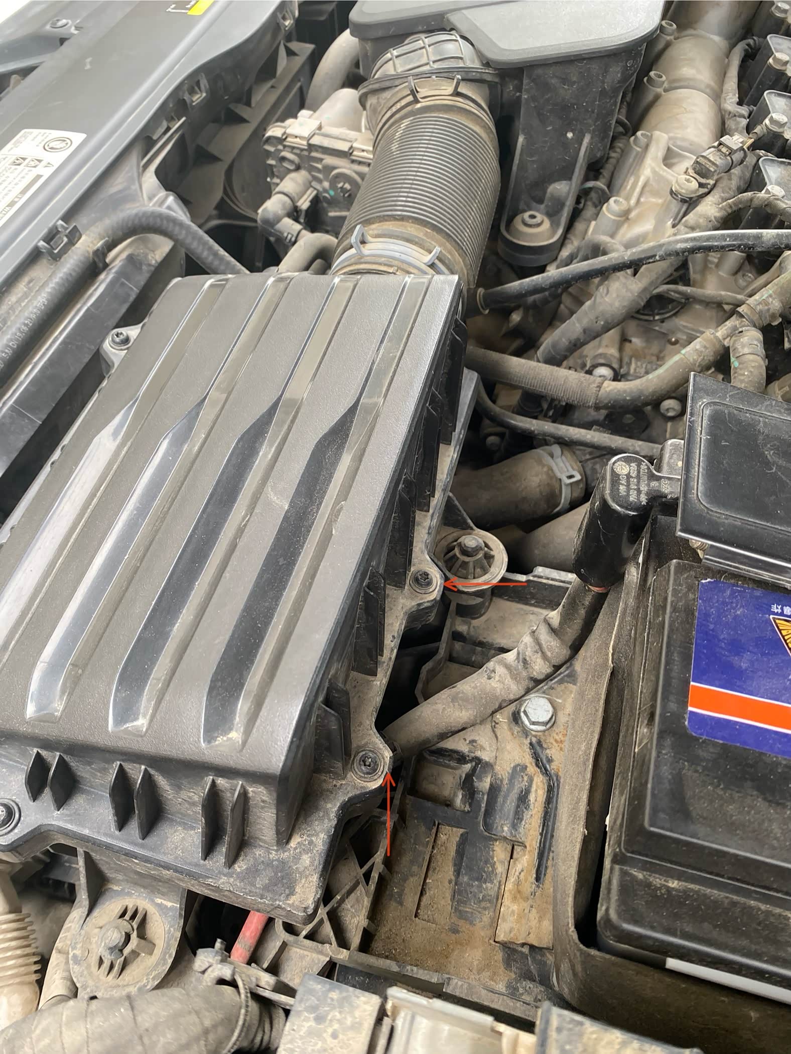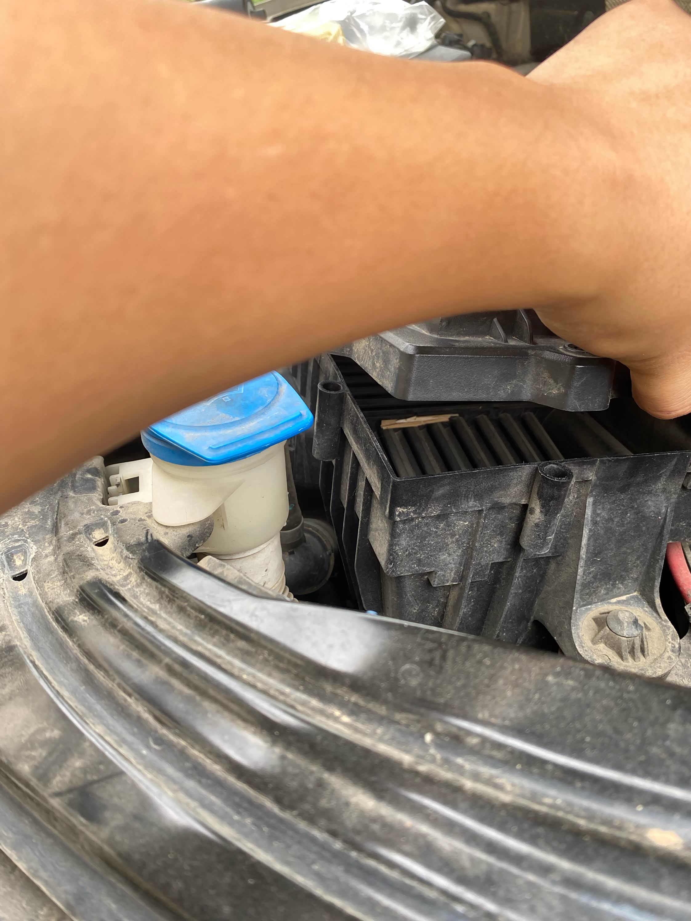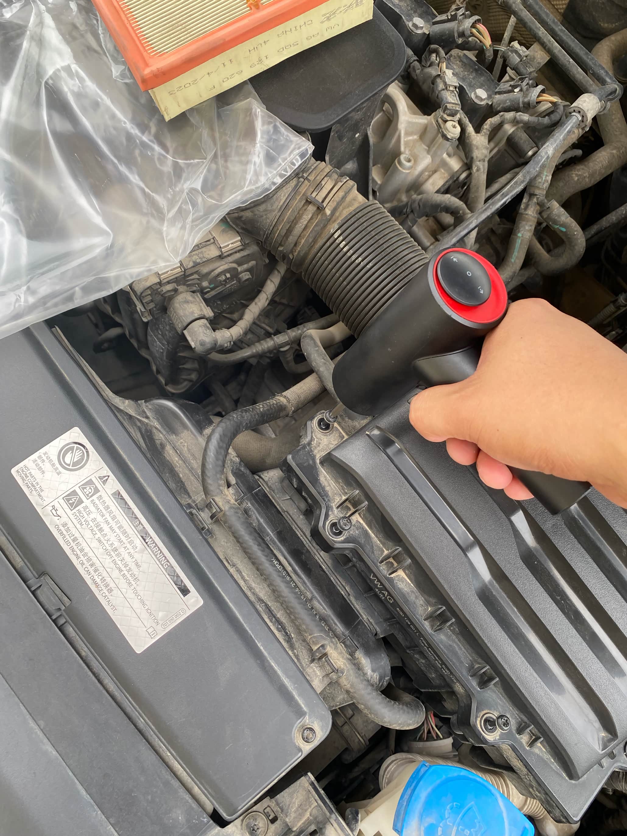 发动机电脑的线束的话会阻挡空气滤芯的拿出,但是只需要我们往左边稍微倾斜一点儿。就可以拿出来了。