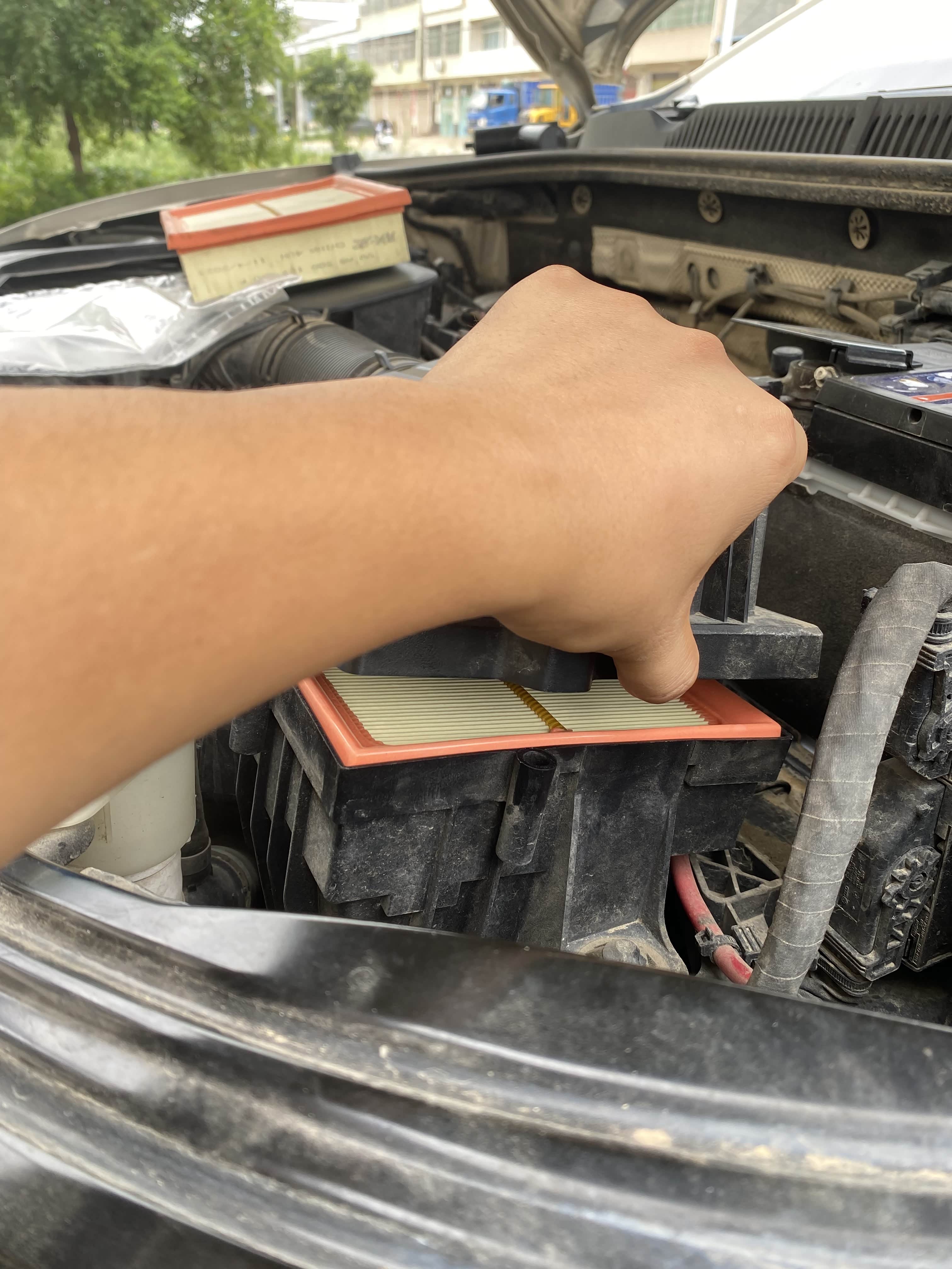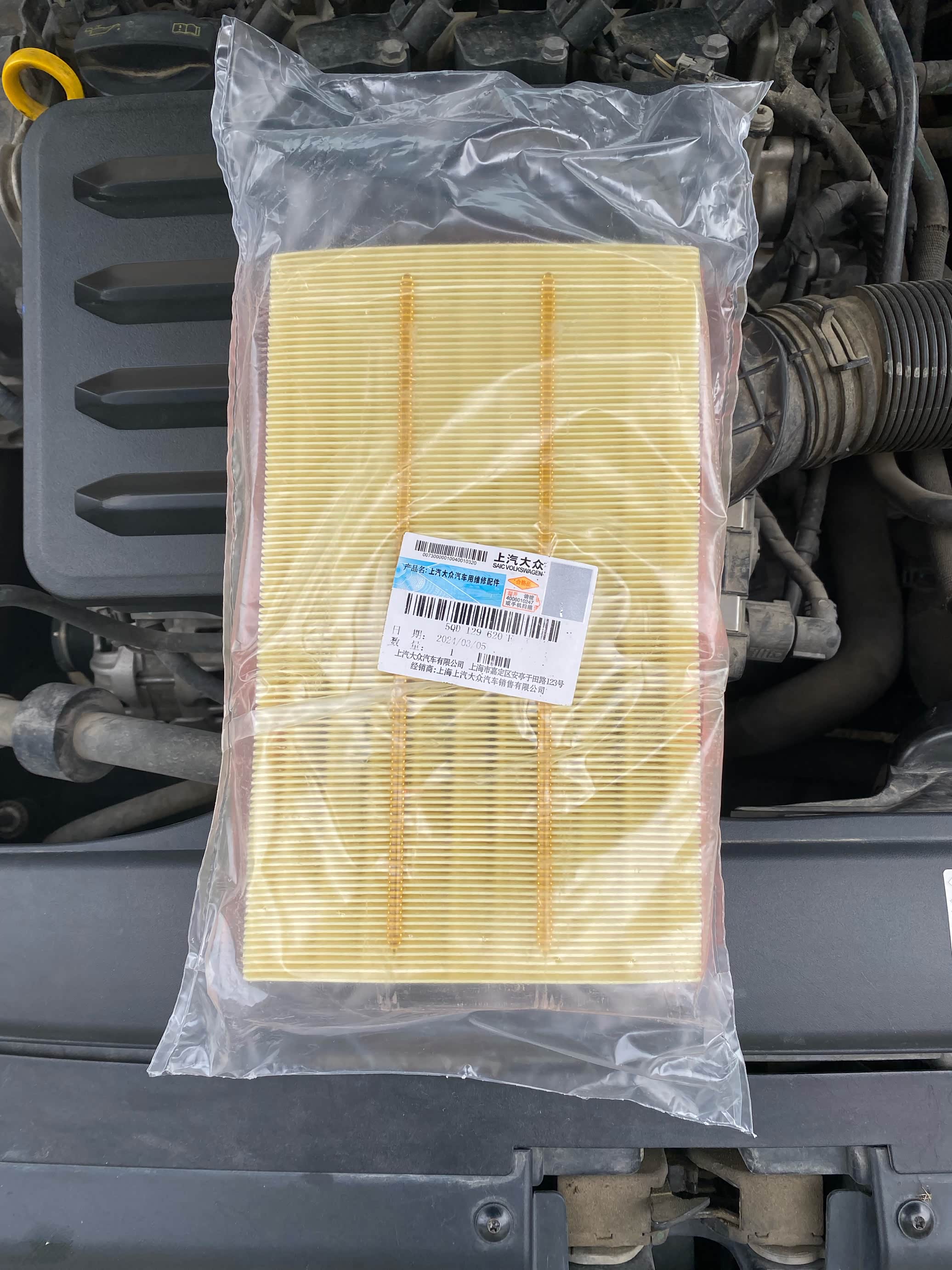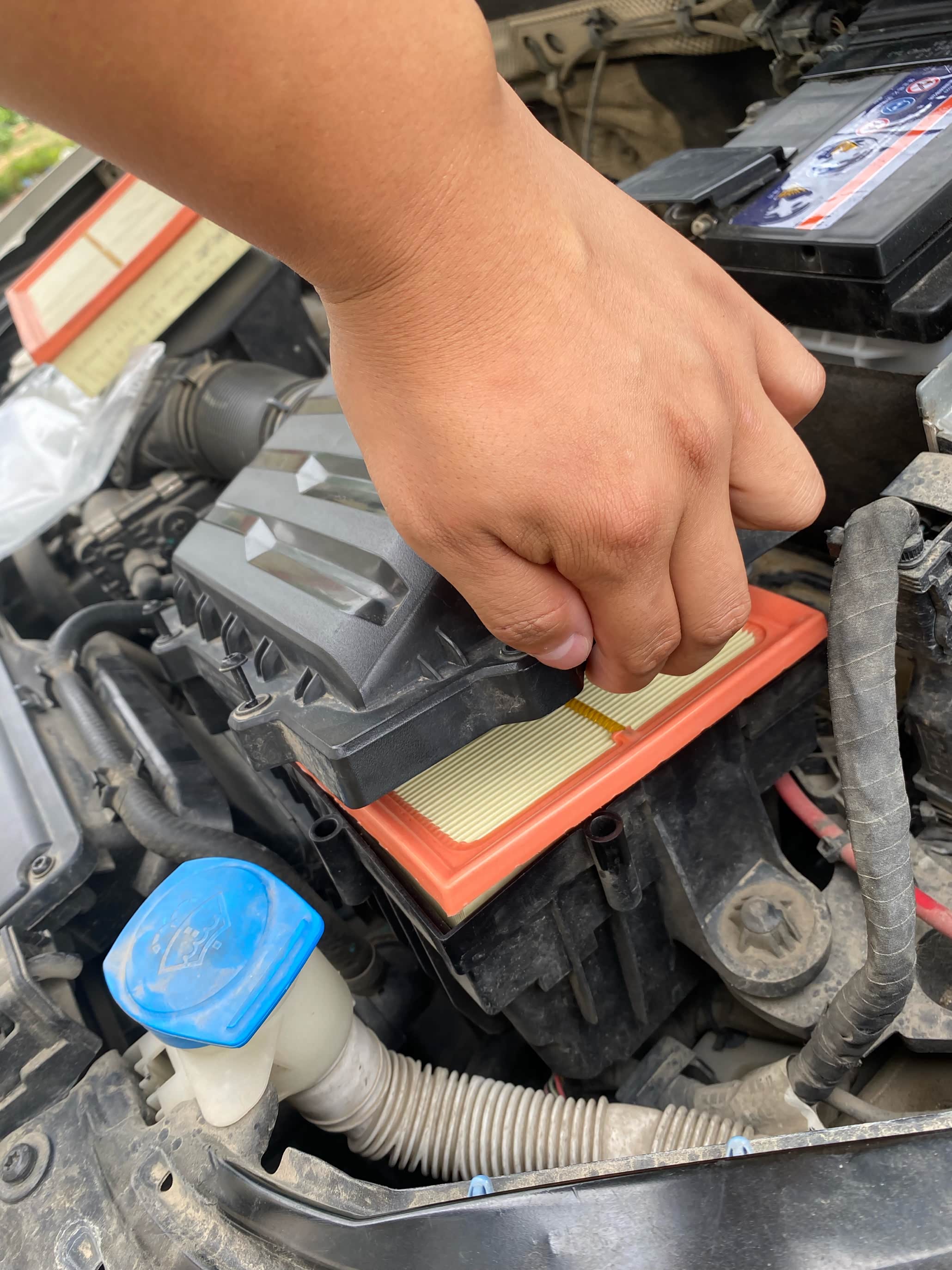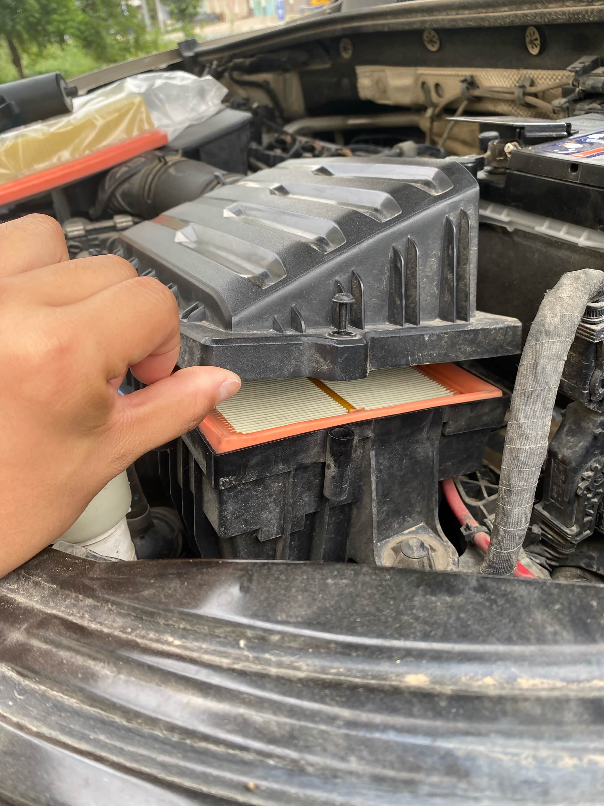 近距离拍照来查看一下。正是因为有了空气滤芯的阻挡,它才不会进入到发动机的内部。既然讲到这里了,就来讲讲空气滤芯的作用,空气滤芯的作用就是空气中的杂质给发动机提供干净的空气。这样子的话可以有效的减少积碳,节省油耗。让发动机保持的干干净净的。空气滤芯的话我们可以选择定期更换或者是检查更换。保养手册的话好像是2万km更换一次。但是也要根据我们的日常使用情况来判断。如果说灰尘比较大,那我们可以提早更换,如果说环境比较好,当然也可以延长更换。这个并没有明确的标注