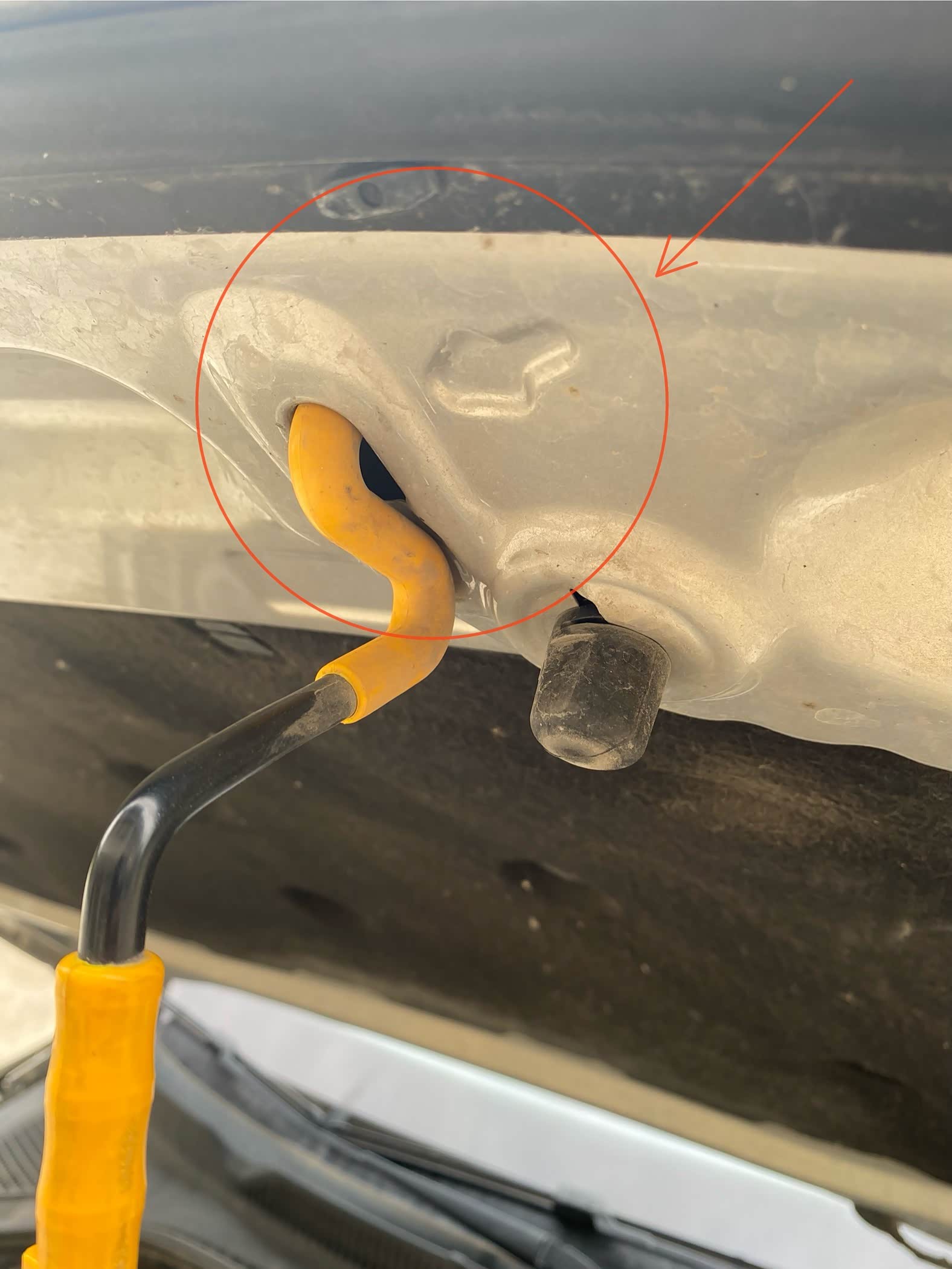 然后用支撑杆把引擎盖给支撑起来,注意原车的位置的话有个线头在指着一个孔位。放在里面的话就不会产生晃动。