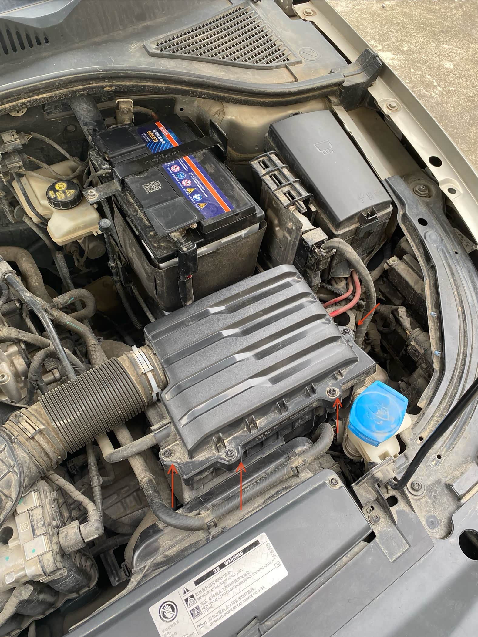 然后再来查看一下空气滤芯的箱体,空气滤芯的箱体连接在进气口。按照常规的拆卸的话,你需要再准备一把空气滤芯的管钳。但是我的车子在4s店也换过空气滤芯为了省事儿就不取下管子。去掉其中的6颗螺丝就可以了。因为第7课的话先用管钳取掉那个管道之后才能取下来。所以说为了省事儿,咱们也不取了。