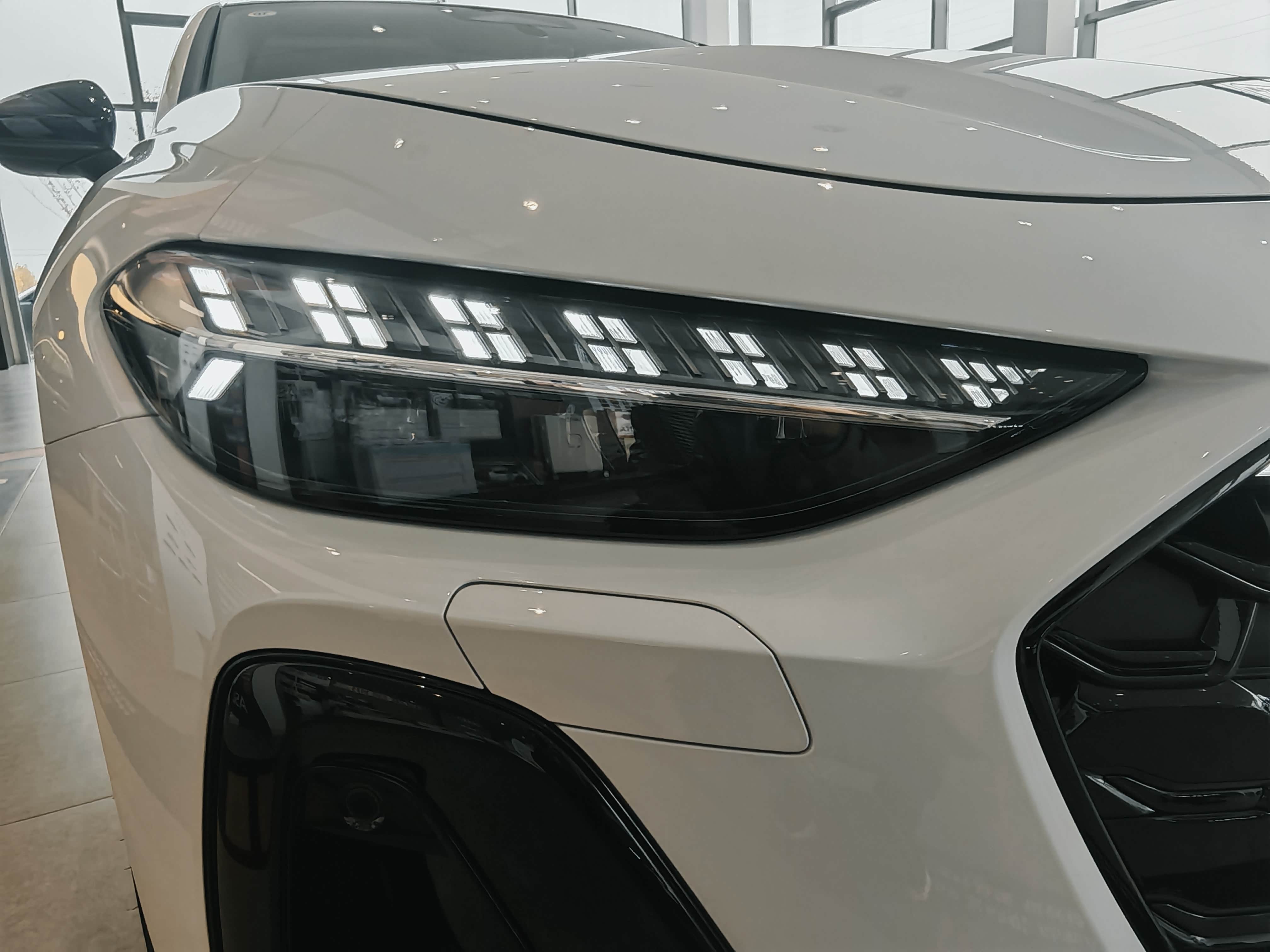 前脸有着经典黑色蜂窝状状的进气格栅设计,上面有着可以点亮的四个圈和车标两侧发光线,辨识度很高,前杠下黑色格栅与导风口装饰件贯穿式设计,一体化设计增加运动与时尚。大灯两层一体设计,上方是日间行车灯,与中网上发光线条和标组成贯穿式灯光设计,下方是标配的矩阵大灯,车灯的形状与前脸圆润的造型如出一辙,整体上视觉冲击典雅而时尚,在保持原创和经典的造型上有自己独特的创新。