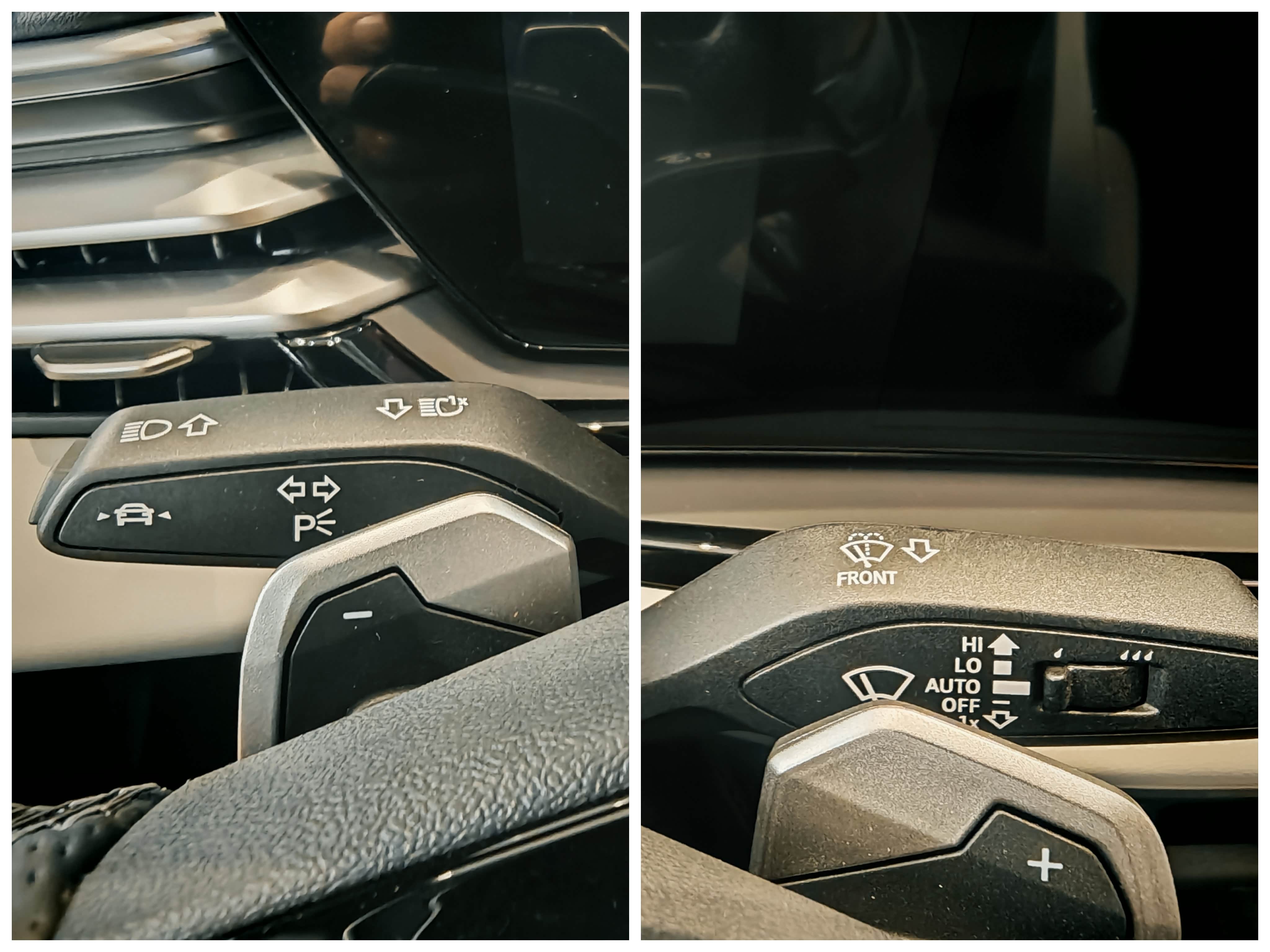 方向盘上还有换挡加减按钮,两侧各有灯杆、雨刷控制杆