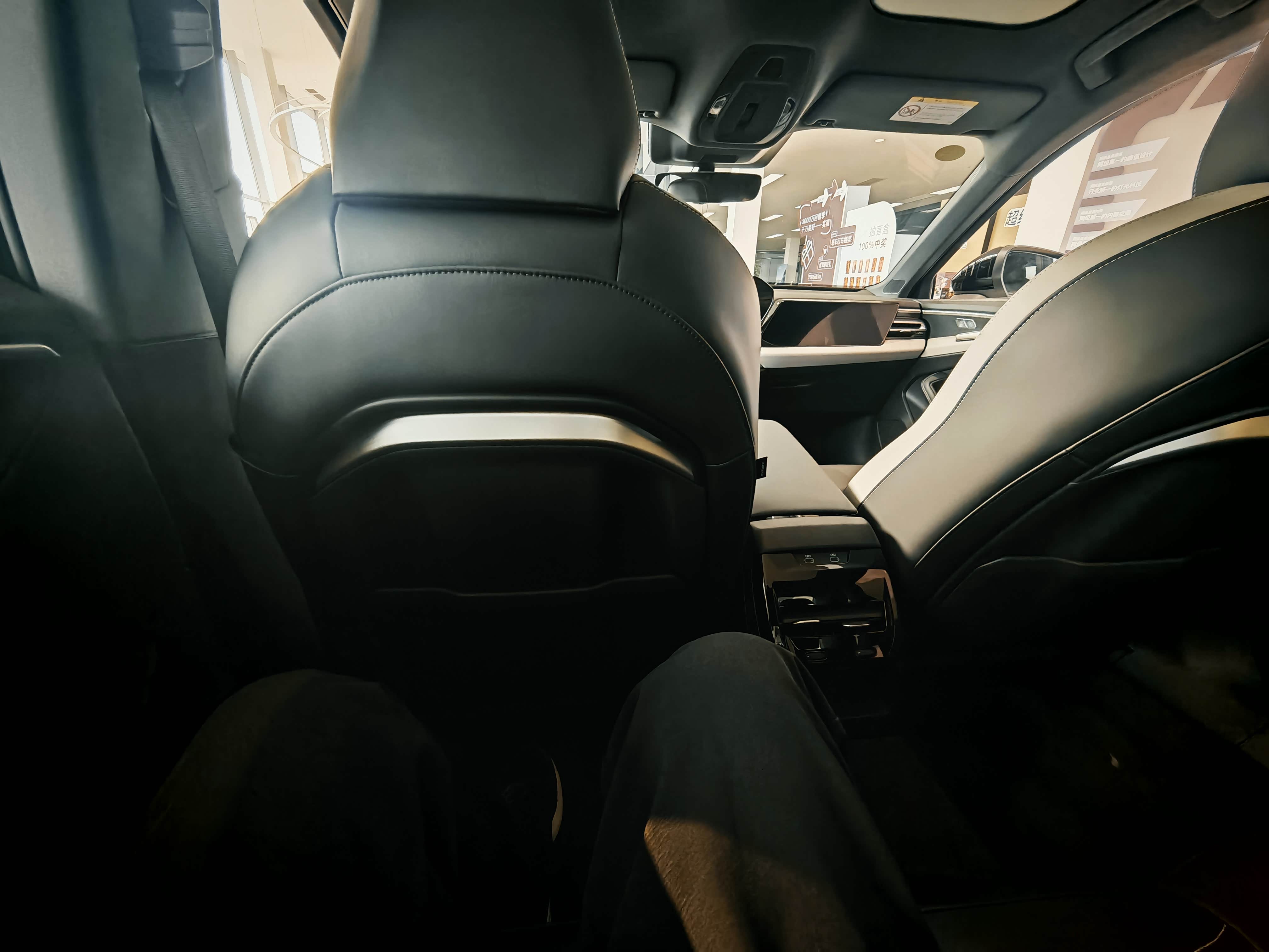 在前排座椅调整好不变的情况下,做进靠着后座椅膝盖距离前座椅差不多有两拳的距离,做的比较舒适一点还有一拳半多的距离,中间隆起部位适合舒适的四人乘坐。
