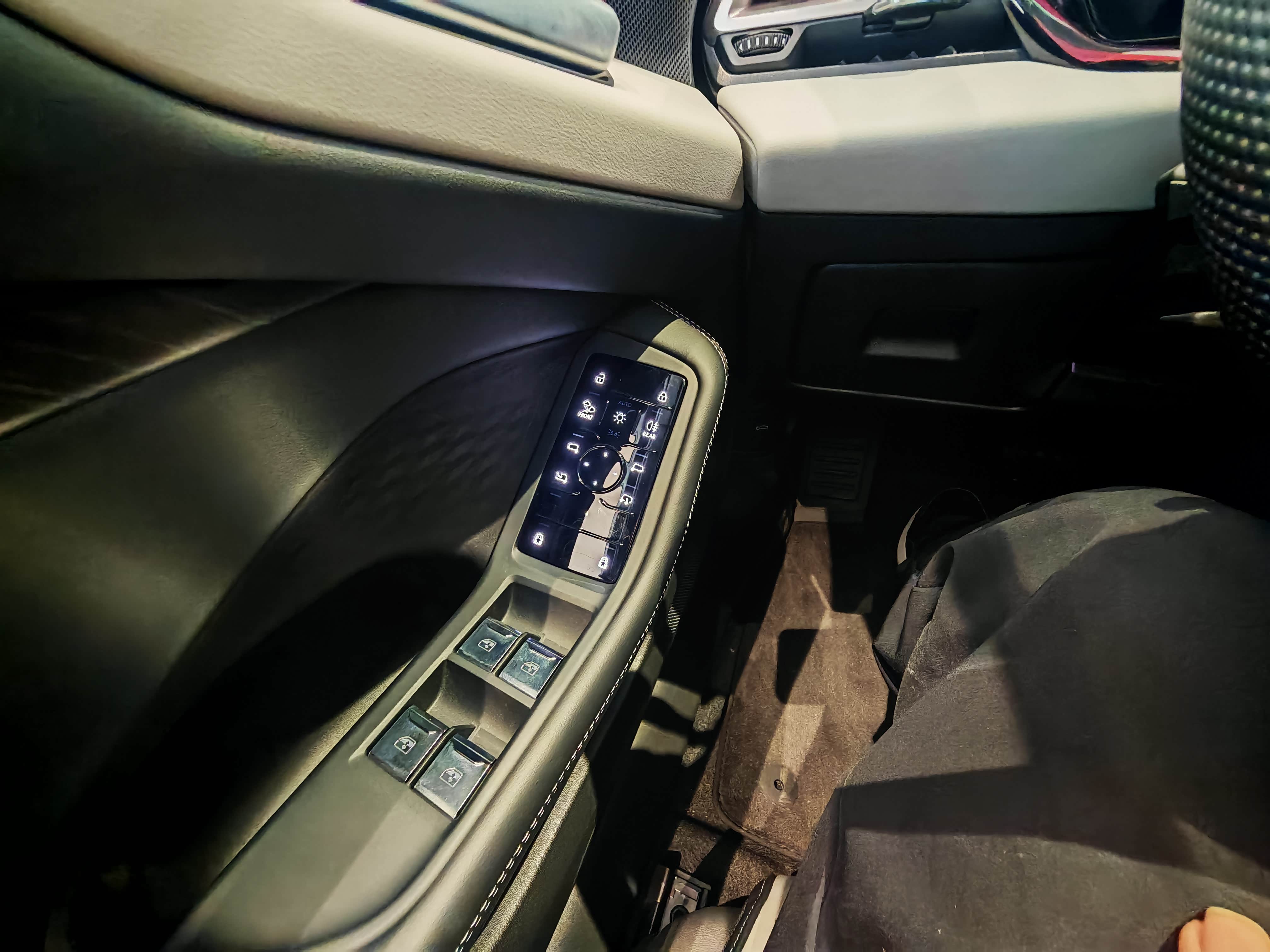 仪表台用料和颜色与车门造型遥相呼应,车门按键大面积镀铬装饰,黑色为主的车门上音响罩也是黑色,大面积的软性搪塑包覆手感更好,真皮座椅两边的颜色与仪表台上一致,主副驾座椅支持多方向调节还有腿托调节,为副驾提供一个舒适的环境。
