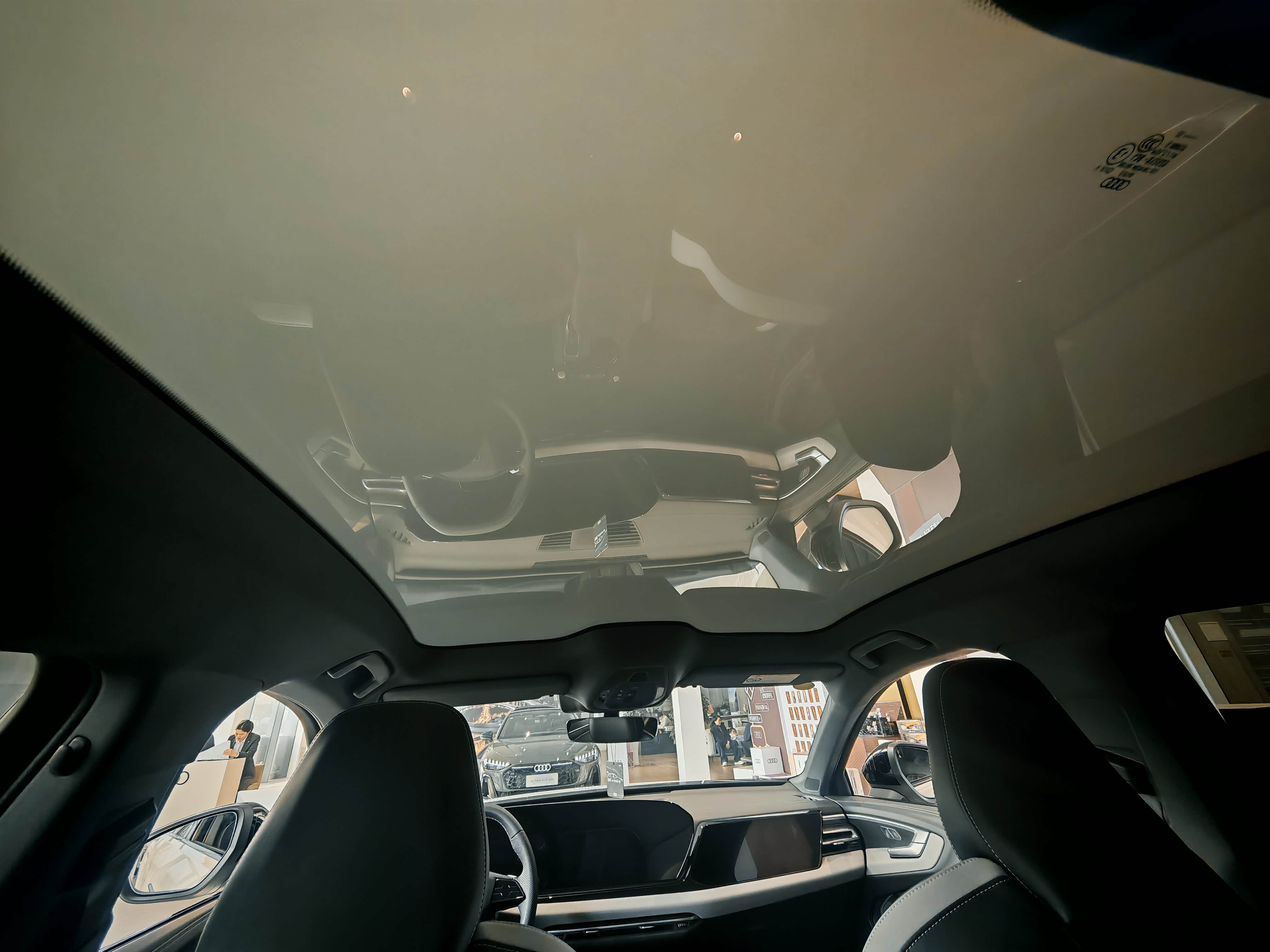 带有全景天幕,可以通过后视镜位置的按键控制开关,可以全透明、全灰、也可以间隔成类似斑马线设计,这个很有创意。