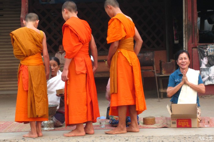 老挝的街头布施, 每次自驾出去都有一种感觉,在路上是一种生活,是一种快乐,是对生命的一种体验。在路上会遇到很多的困难,会吃很多的苦,但痛并快乐的。泰国和老挝这二国家,给我的感觉,是这里的人们都很祥和,特别是泰国人,见人都是笑眯眯的,而且非常乐意帮助人。可能是从小就进寺庙修行的缘故吧。就是有一点,在泰国卫生间比食品还干净,他们的食品我倒不敢恭维。在泰国和老挝治安很好,大街上就没有看到一个110.特别是交通,泰国的公路不限速,连我们都跟着开快车,我们去了这么多天就没有看到一起车祸。那里的驾驶员很有车德,在斑马线会主动停车让人。给我的感觉就是,在那里开车太好开了。而且在老挝的琅勃拉邦这个小城,还没有红绿灯。遗憾的是在国外语言不通,只有靠肢体语言来交流,闹了很多的笑话,呵呵,不管怎么样,还是闯过来了。